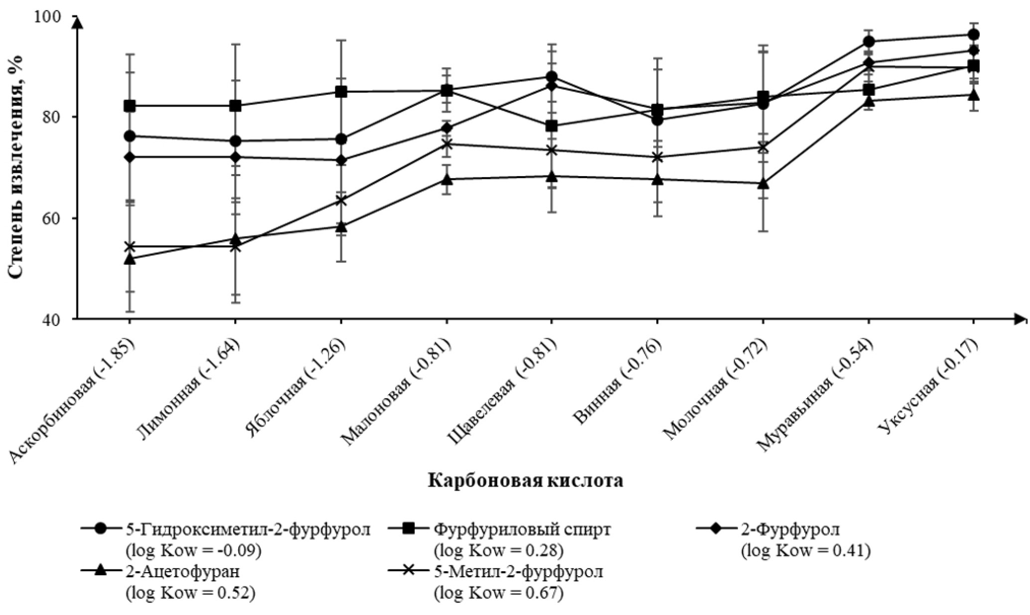 С целью выбора эффективного экстрагента изучали влияние природы прекурсора ЭР (донора ВС) на степень извлечения аналитов при соотношении фаз 1 : 1. Для этого в пробирке емк. 2.0 мл к 500 мкл трансформаторного масла с концентрацией аналитов 500 мкг/л добавляли 500 мкл трехкомпонентного ЭР. Для достижения экстракционного равновесия полученные системы перемешивали в течение 30 мин с использованием вихревого диспергатора. После этого систему центрифугировали при 5000 об/мин в течение 3 мин. Экстракт отбирали для последующего анализа методом ВЭЖХ-УФ. Исходя из полученных данных (рис. 1), можно сделать вывод, что в случае наиболее полярных аналитов, таких как 5-гидроксиметил-2-фурфурол и фурфуриловый спирт (lgKow = –0.09 и 0.28 [21] соответственно), степень извлечения практически не зависит от природы донора ВС. Это связано с тем, что данные аналиты имеют в своей структуре гидроксильные группы, способные к образованию ВС с компонентами ЭР. В случае остальных аналитов наиболее удовлетворительное извлечение показал ЭР на основе холина хлорида и уксусной кислоты (1 : 1, моль/моль) с 10 % воды, который выбрали для дальнейших исследований (степени извлечения всех аналитов находились в диапазоне от 85 до 96 %). Это связано с тем, что полярность прекурсора ЭР – уксусной кислоты (log Kow = –0.17 [21]) наиболее близка к полярности 2-фурфурола, 2-ацетофурана и 5-метил-2-фурфурола (lgKow = 0.42, 0.52 и 0.67 [21] соответственно), что позволяет обеспечить максимальное сродство аналитов к экстрагенту.