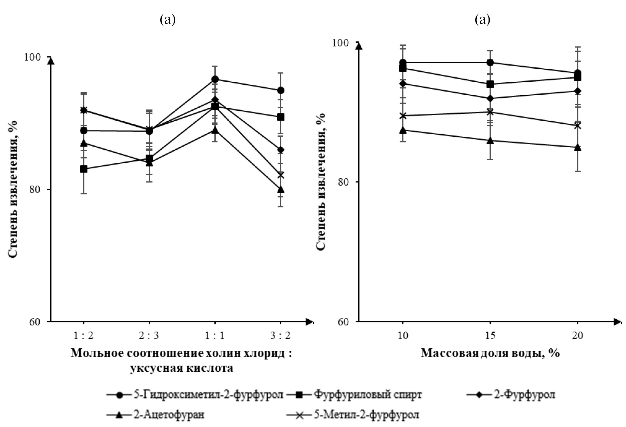 Мольное соотношение прекурсоров ЭР может оказывать влияние на эффективность массопереноса аналитов из фазы трансформаторного масла. Для изучения влияния данного фактора определяли степень извлечения аналитов в условиях равновесия в экстракционной системе при использовании ЭР с различным мольным отношением холин хлорида и уксусной кислоты (от 1 : 2 до 3 : 2) при постоянном содержании воды (10 %). Установили (рис. 2а), что увеличение содержания уксусной кислоты в составе ЭР закономерно приводит к увеличению степени извлечения менее полярных аналитов (2-фурфурол, 2-ацетофуран и 5-метил-2-фурфурол). В дальнейших исследованиях использовали ЭР с мольным отношением уксусной кислоты и хлорида холина 1 : 1, поскольку при таком соотношении достигнуто максимальное извлечение всех пяти аналитов.