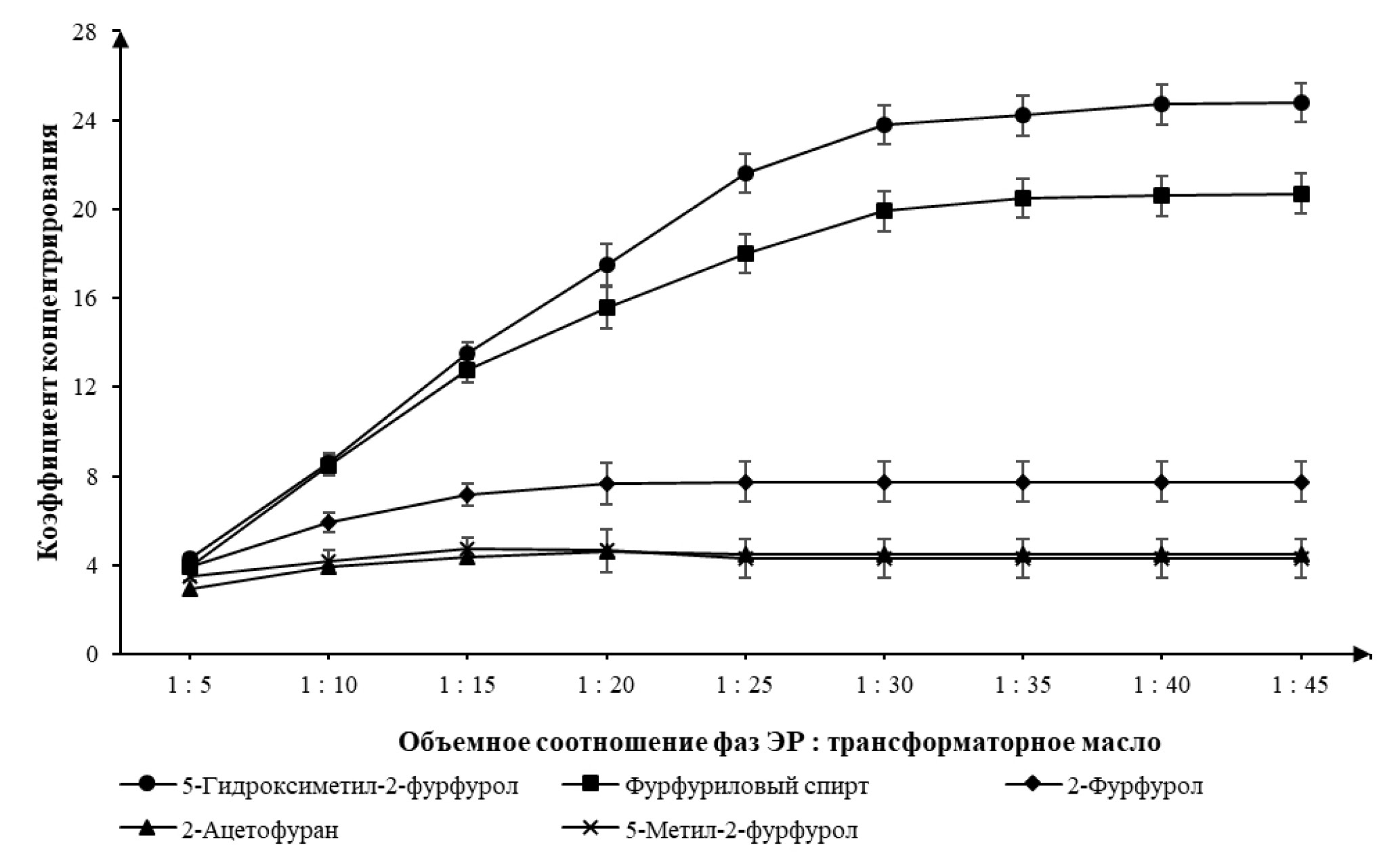 Для снижения пределов обнаружения применяли стадию концентрирования аналитов. Варьировали соотношение фаз экстрагента и трансформаторного масла от 1 : 5 до 1 : 45. При этом объем ЭР составлял 100 мкл, что соответствует концепции микроэкстракции [13]. Установили (рис. 3), что при увеличении объемного соотношения фаз значения коэффициентов концентрирования менее полярных аналитов уменьшаются значительно сильнее, чем более полярных. В качестве оптимального значения для дальнейших исследований выбрали объемное соотношение 1: 40 ввиду достижения режима равновесного насыщения для всех пяти аналитов.