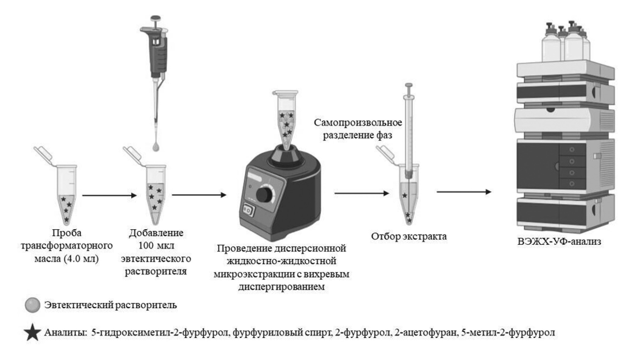 В качестве экстрагентов нового поколения предложены эвтектические растворители (ЭР) [15]. С термодинамической точки зрения ЭР представляют собой смесь кислот и оснований Льюиса и Бренстеда, которая обладает эвтектической точкой, температура плавления смеси в которой ниже, чем при образовании идеального раствора между компонентами [16]. В зависимости от устойчивости ЭР при контакте с водой предложено их разделять на гидрофильные, квазигидрофобные и гидрофобные [17]. Варьируя химическую природу и соотношение прекурсоров ЭР, можно создавать эффективные экстрагенты, способные извлекать аналиты из матриц различной полярности. Дополнительным преимуществом ЭР является то, что компоненты для их приготовления являются недорогими, нетоксичными и часто биоразлагаемыми [18, 19]. Кроме того, ЭР обладают такими свойствами, как высокая термическая стабильность, низкое давление насыщенных паров и негорючесть, что открывает широкие возможности их применения в аналитической химии [20]. Несмотря на большую востребованность выполнения “фурановых тестов”, способ выделения фурановых производных из трансформаторного масла в ЭР на принципах ДЖЖМЭ с вихревым диспергированием ранее не был реализован.