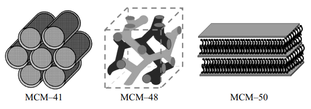 Особый интерес наноструктурированные кремнеземы вызвали после публикаций группы ученых компании Mobil Oil Corporation [15]. Варьируя условия, были получены кремнеземы с гексагональной (MCM-41), кубической (MCM-48) и слоистой структурой (MCM-50) (рис. 2). Размер пор составил 1.5–10 нм в зависимости от длины цепи структуронаправляющего компонента. Первые упорядоченные мезопористые кремнеземы получали в присутствии ионогенных ПАВ (шаблонов), взаимодействующих с силикатом за счет электростатических сил. Согласно предложенному механизму формирования кремнезема, силикат-ионы конденсировались на уже организованных мицеллах [29]. Однако в последствии было показано, что такие материалы образуются в результате более сложных процессов [45].
