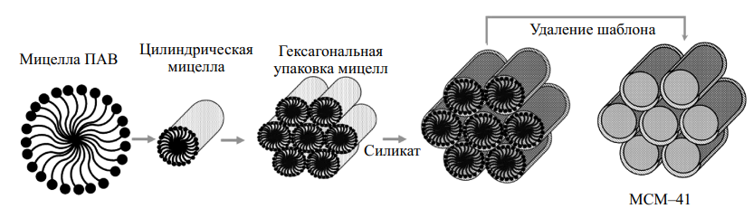Рис. 2. Схема синтеза упорядоченных мезопористых кремнеземов (на примере MCM-41).