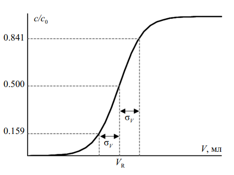 Рис. 3. Типичный вид выходной кривой. VR – объем удерживания, σV – стандартное отклонение объема удерживания вещества при его перемещении в сорбенте.