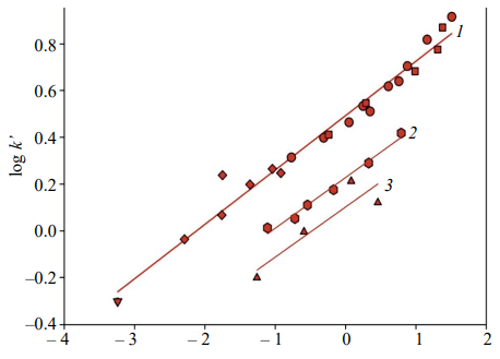The chromatographic retention of neutral polar compounds (alcohols, ketones, carboxylic acids, carbohydrates, and sweeteners) and compounds in ionized form (mono- and dibasic organic acids) on cation exchange columns filled with sulfonated poly(styrene-divinylbenzene) with a crosslinking degree of 8 % (Nautilus-IE) and 10 % (Sevko AA) is studied in a variant of ion exclusion chromatography. Using 5 mM sulfuric acid, the retention parameters of the compounds are determined and new patterns are obtained that clarify the mechanism of retention of organic acids in the ion-exclusion chromatography variant. It is found that the retention of all the studied compounds (logk’) is directly proportional to the hydrophobicity values logPexp). In this case, the electrostatic repulsion of organic acids from the sulfo groups of the cation exchanger shifts the logk’–logPexp dependences by a fixed value proportional to the number of carboxyl groups. The possibility of using the Sevko AA column not only for amino acid analysis, but also for ion exclusion chromatographic determination of organic acids and alcohols in complex samples with simultaneous spectrophotometric and refractometric detection is shown.