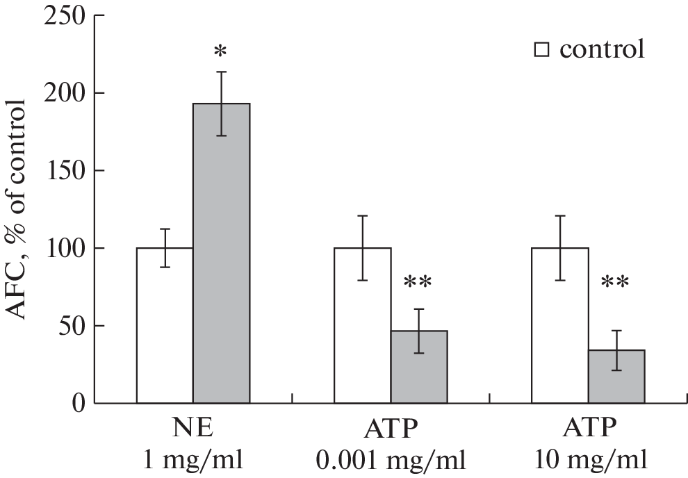 In experiments on rats, the participation of co-mediators of the sympathetic nervous system in the suppressive effect of deep cooling on the antibody-forming function of the spleen was studied. Studied: 1) the effect of deep cooling (decrease in deep temperature by 3–4°С), 2) the introduction of the mediator of the sympathetic nervous system norepinephrine (NE, 1 mg/ml), 3) its co-transmitter ATP (0.01 mg/ml and 10 mg/ml) and 4) P2X-purinergic receptor blocker PPADS on the number of antibody-forming cells of the spleen in response to immunization with sheep erythrocytes. Deep cooling as well as ATP inhibited, while NE stimulated antibody formation in the spleen. Blockade of P2X-purinergic receptors by PPADS stimulated antibody formation in the norm. Against the background of blockade of P2X-purinergic receptors, the inhibitory effect of ATP and deep cooling on antibody formation was not manifested. The results obtained indicate the opposite effects of co-mediators of the sympathetic nervous system on antibody formation in the spleen and suggest that the inhibitory effect of cold on antibody formation in the spleen occurs with the participation of ATP through P2X-purinergic receptors.