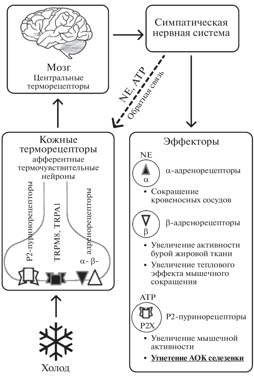 - Kozyreva TV, Meyta ES, Khramova GM (2015) Effect of the sympathetic nervous system co-transmitters ATP and norepinephrine on thermoregulatory response to cooling. Temperature 2 (1): 121–128. https://doi.org/10.1080/23328940.2014.1000705