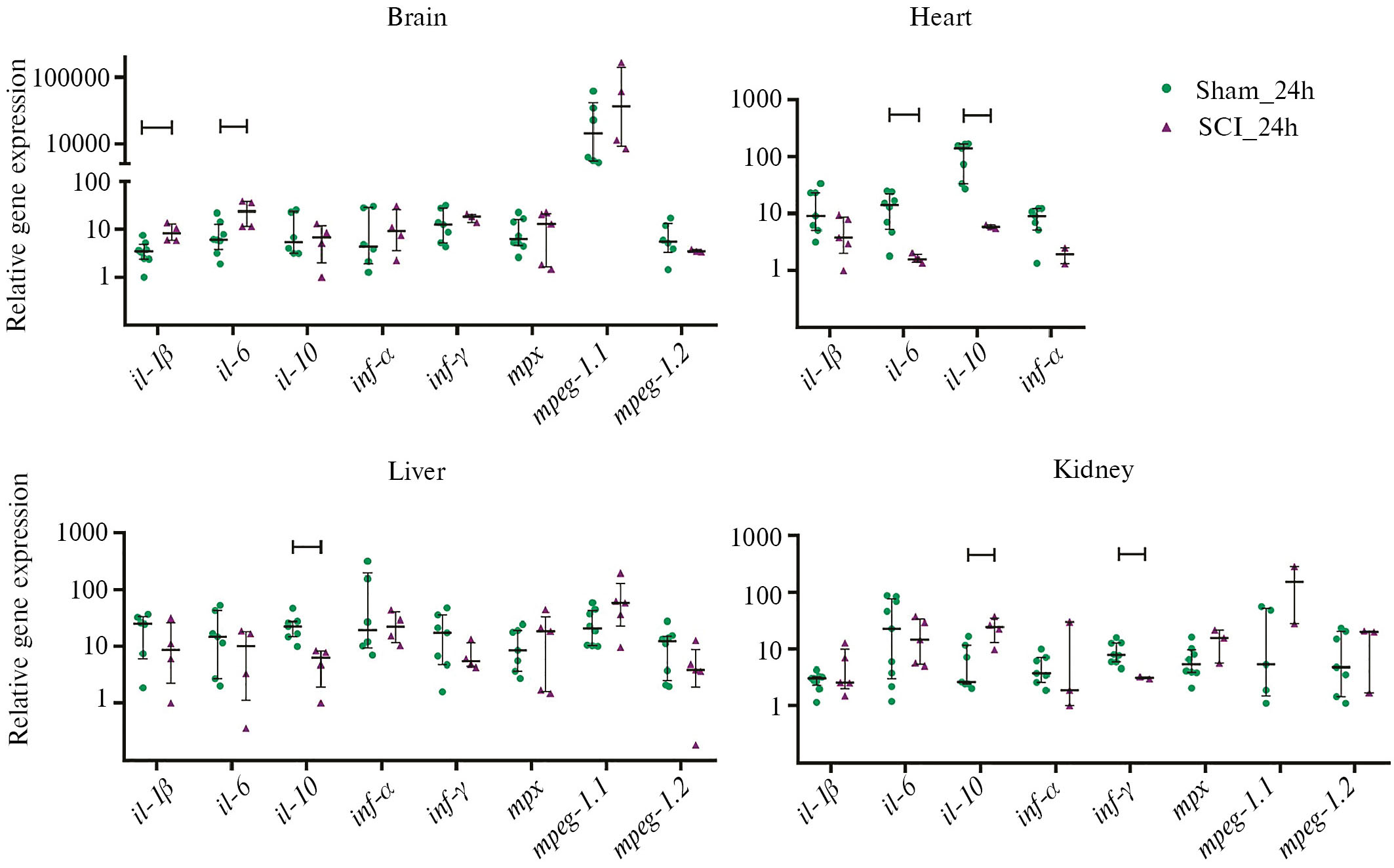 Полная транссекция спинного мозга у рыб Danio rerio (группа SCI_24h) через 24 ч после операции характеризовалась достоверным увеличением уровня экспрессии в тканях мозга генов il-1β (р=0.02) и il-6 (р=0.04) по сравнению с контрольной группой Sham_24h; в тканях сердца достоверным снижением уровня экспрессии генов il-6 (р=0.01) и il-10 (р=0.02); в ткани печени достоверным снижением уровня экспрессии только гена il-10 (р=0.01); тогда как в тканях почки достоверным увеличением уровня экспрессии гена il-10 (р=0.02) и одновременным снижением уровня экспрессии гена ifn-γ (р=0.04) (рис. 3, табл. 1).