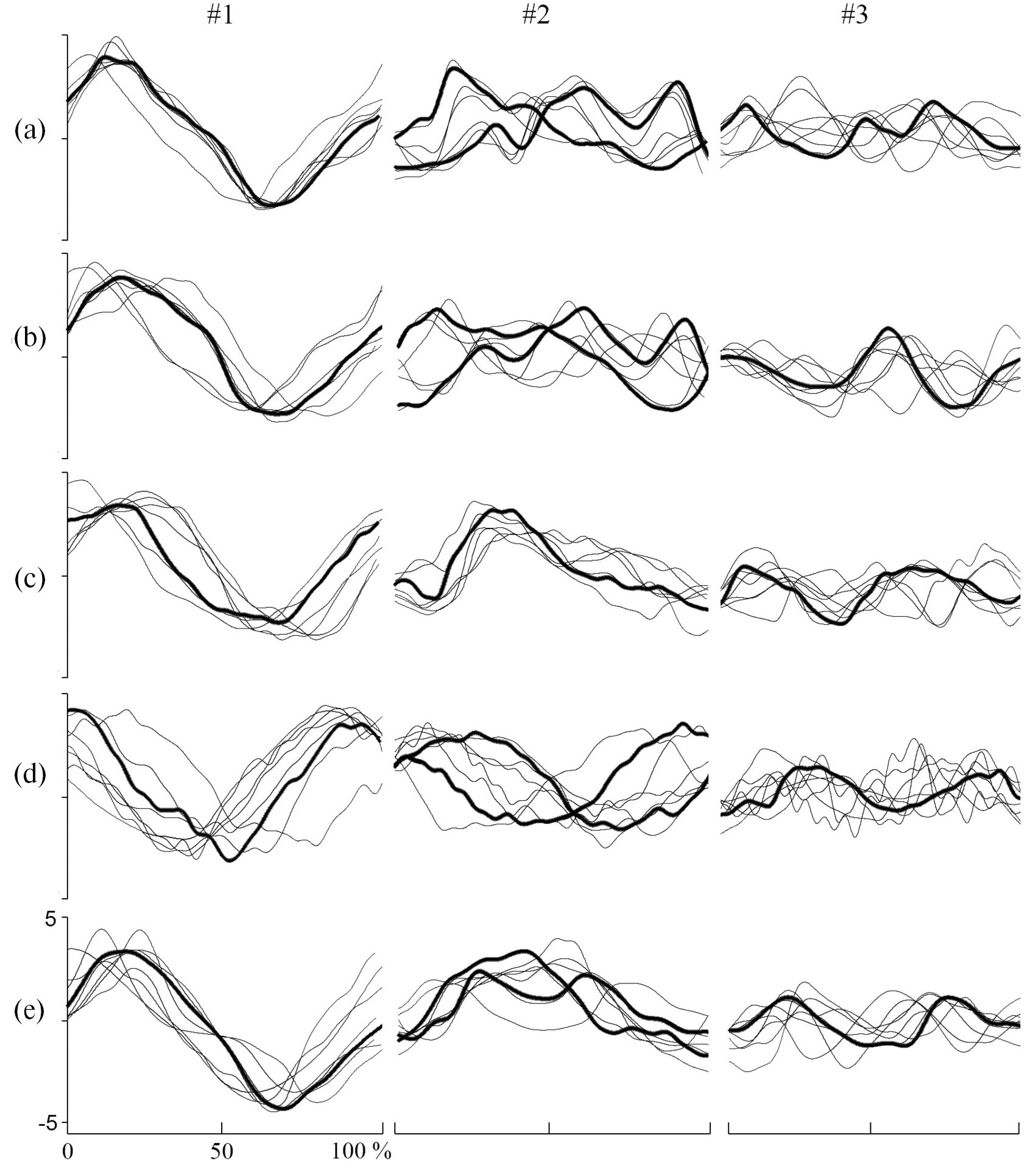Рис. 2. Паттерны временнόй активации мышечных синергий при ходьбе в условиях разной степени вывески веса тела. По оси абсцисс – прогресс цикла шага, по оси ординат – у. е. #1, 2, 3 – номер компоненты (синергии). Тонкие линии – усредненные внутрииндивидуальные профили, жирные линии – среднегрупповой профиль. Степень вывески веса тела: (a) – без вывески, (b) – 25%, (c) – 50%, (d) – 100%, (e) – проталкивание ленты пассивного тредбана.