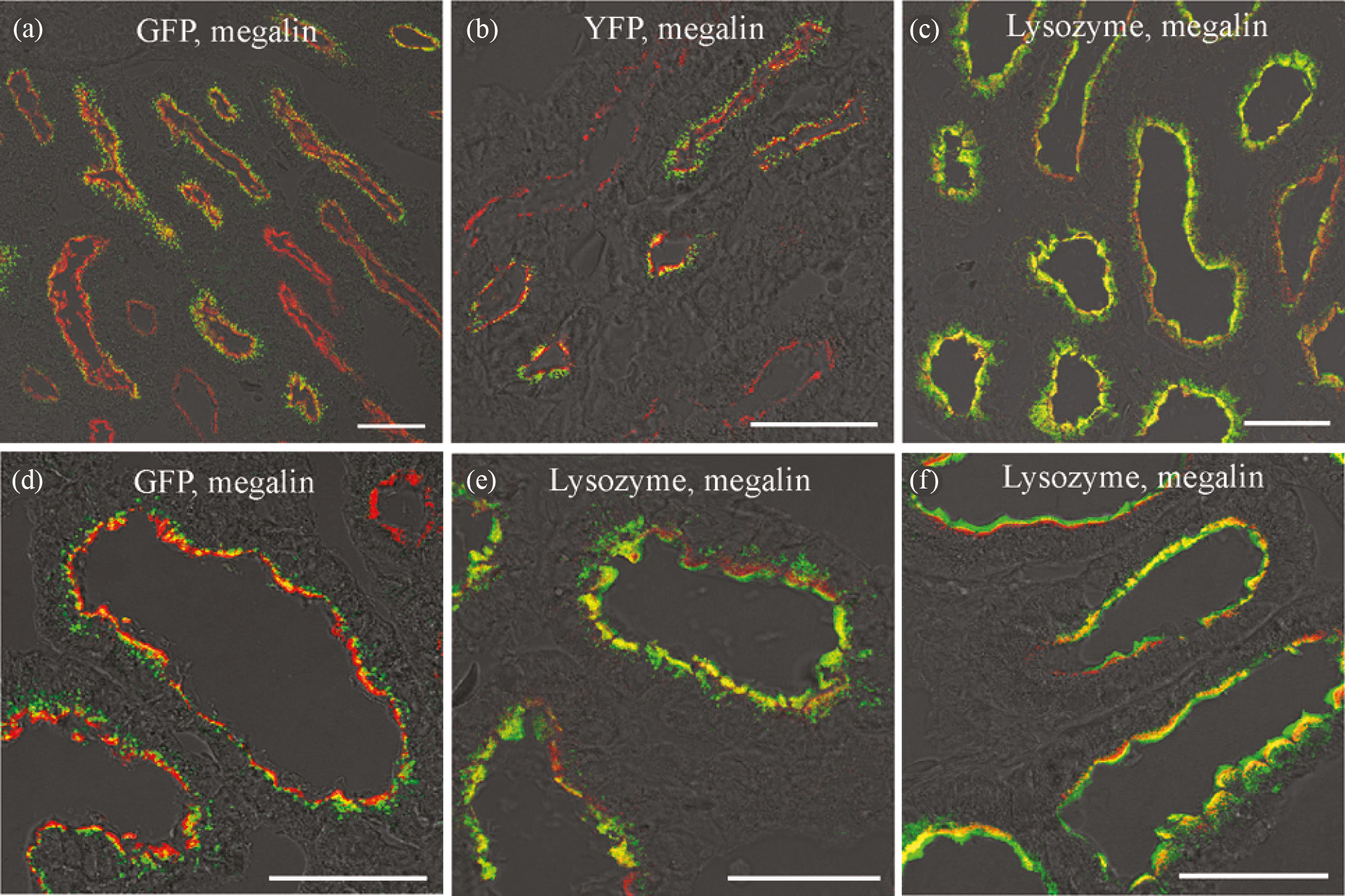 Рис. 1. Реабсорбция GFP, YFP и лизоцима (Lysosyme) в иммунопозитивных к мегалину (megalin) проксимальных канальцах почек у озерных лягушек. (a–f) – профили проксимальных канальцев в контроле (a–e) и после предварительного введения NaCl (f). Сигналы: мегалин-Alexa 568 – красный, GFP, YFP и лизоцим-Alexa 488 – зелёный и колокализованное свечение – желто-оранжевый. Видно присутствие белков в большинстве мегалин-позитивных канальцев (a–c), образование многочисленных GFP-содержащих везикул (d), везикулярное и диффузное свечение лизоцима (e, f) и аккумуляция лизоцима в щёточной каемке эпителиоцитов (f). Конфокальная микроскопия, совмещённые изображения. Калибровка: 50 мкм.