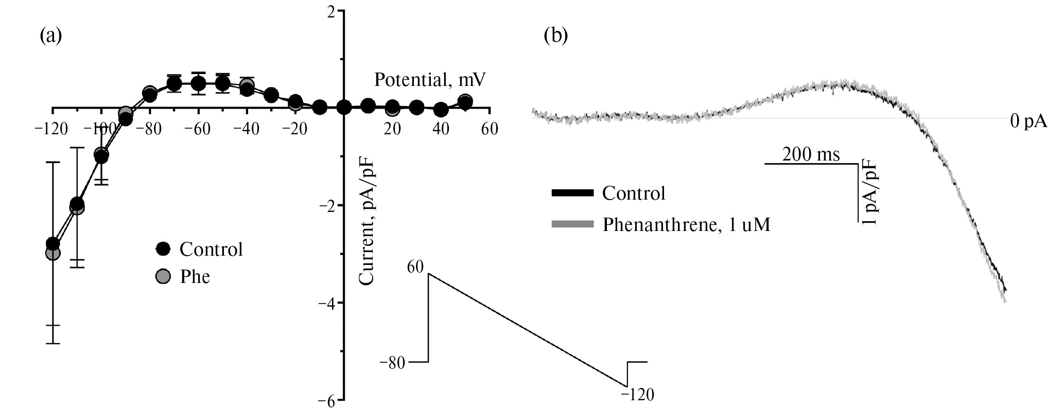 В отличие от тока IKr, ток входящего выпрямления IK1 оказался нечувствителен к действию фенантрена: не было замечено каких-либо изменений в амплитуде IK1. Репрезентативные примеры записей IK1 в контрольных условиях и под действием 1 мкМ фенантрена представлены на рис. 3b.