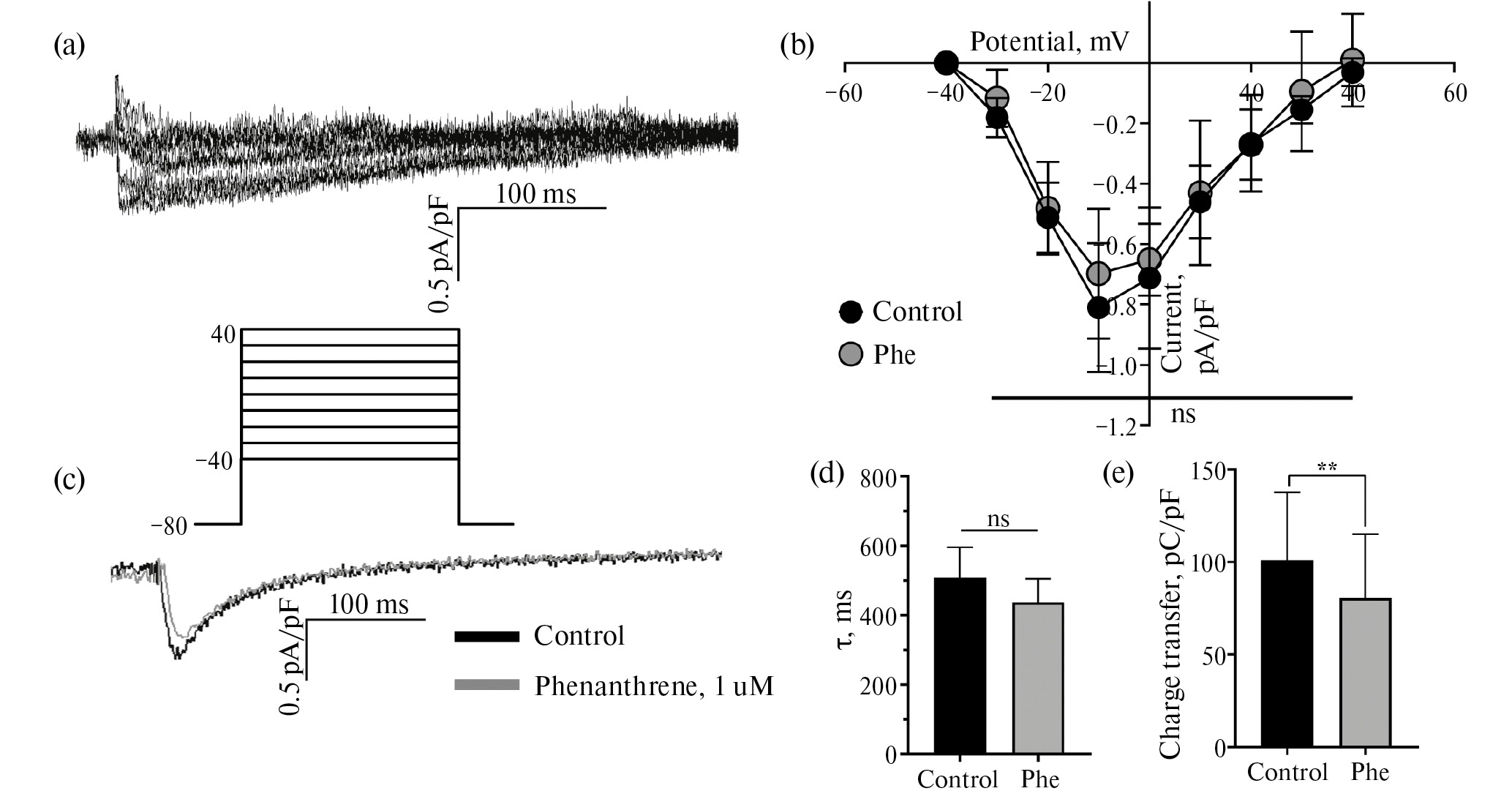Фенантрен (1 мкМ) во внеклеточном растворе крайне слабо влиял на амплитуду ICa: в присутствии фенантрена пиковая амплитуда ICa снижалась на 15.54 ± 7.64%; различия были статистически незначимыми. Кроме того, под действием фенантрена кинетика инактивации ICa имела тенденцию к ускорению, однако снижение временной константы инактивации τ под действием фенантрена также оказалось статистически незначимым (см. рис. 5d). Однако, несмотря на то что изменения этих параметров по отдельности были статистически незначимыми, анализ количества заряда, переносимого ICa, показал, что воздействие фенантрена приводит к статистически значимому снижению суммарного входа кальция — на 25.17 ± 5.73% (рис. 5e). Описываемый эффект наблюдался начиная с 5-й минуты подачи раствора, содержащего фенантрен, в экспериментальную камеру.