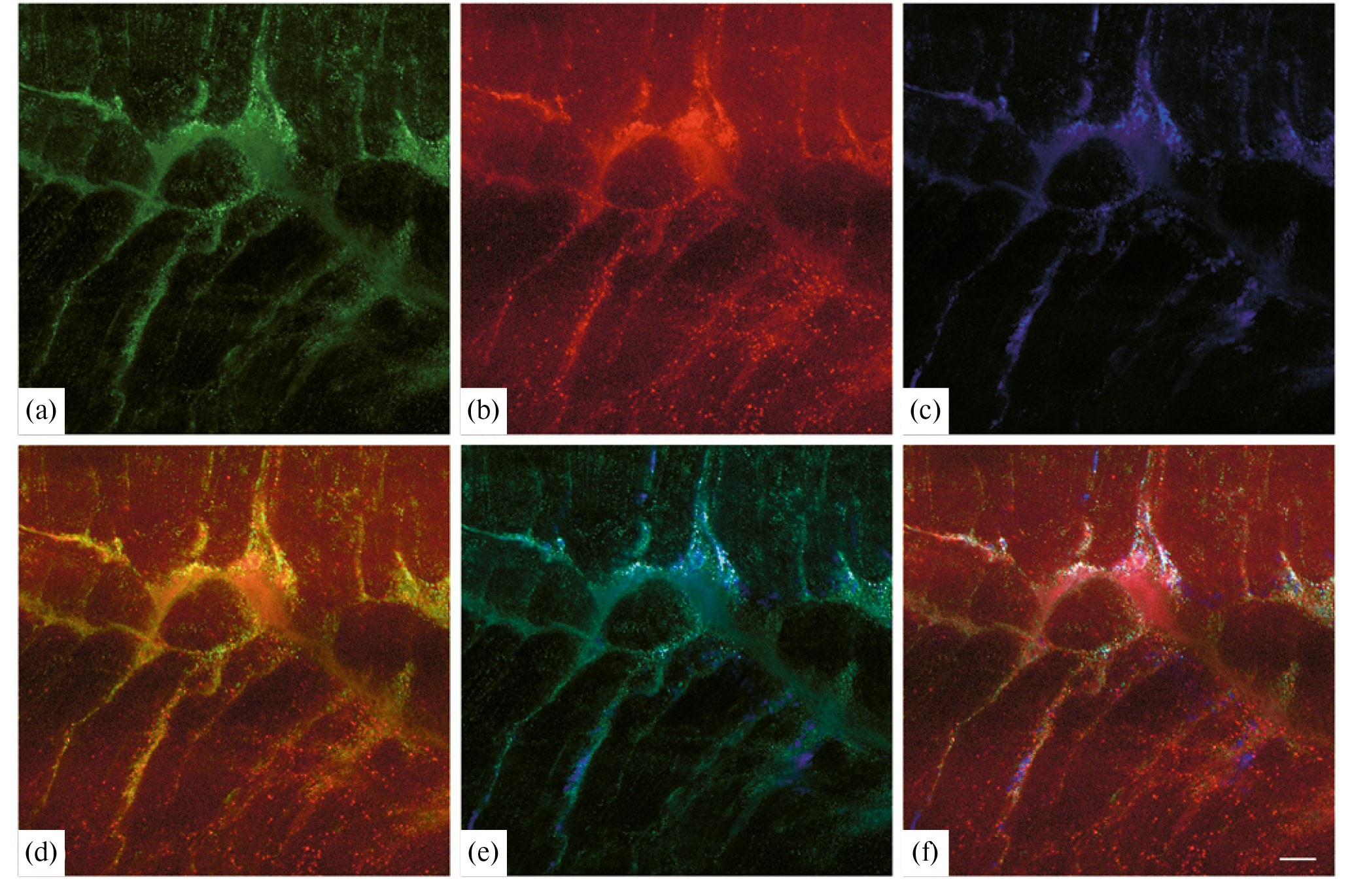 Рис. 6. Наличие кальциневрина А при флуоресцентном тройном мечении препарата соматических мышечных клеток дождевого червя. (a) – Иммуномечение антителами к кальциневрину А (зеленый цвет); (b) – иммуномечение антителами к пресинаптическому белку синаптофизину (красный цвет); (c) – мечение нАХР при помощи ТМР-α-Б (синий цвет); (d) – наложение изображений (a) и (b); (e) – наложение изображений (a) и (c); (f) – наложение изображений (a), (b) и (c). Масштаб 20 µm.
