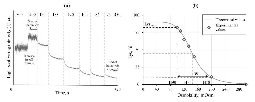 Рис. 2. Пример первичных данных, полученных мануальным методом лазерной дифракции, и визуализация ключевых параметров на лизисной кривой. (a) — метод лазерной дифракции (мануальный). Интенсивность светорассеяния возрастает ввиду роста объема клеток при осмоляльностях 200 и 150 мОсм. Затем падает по мере дальнейшего снижения осмоляльности в результате гемолизиса. Точка перед началом лизиса (Rmax ) — 150 мОсм. (b) — лизисная кривая, построенная по описанному алгоритму. Данные получены на эритроцитах птиц для демонстрации неполного лизиса клеток и параметра Lysmax. Отображены ключевые параметры, характеризующие устойчивость эритроцитов (H50, H90, H10, W и, Lysmax).