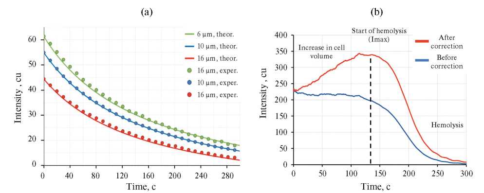 Рис. 3. Коррекция интенсивности светорассеяния. (a) — теоретические и экспериментальные зависимости интенсивности от концентрации дисперсных частиц для латексов диаметрами 6, 10 и 16 мкм. Теоретические и экспериментальные зависимости совпадают при kd = 6.3, õV = 8.33. (b) — интенсивности светорассеяния до и после коррекции. Данные получены на эритроцитах человека. На скорректированной зависимости представлен рост интенсивности ввиду увеличения объема эритроцитов.
