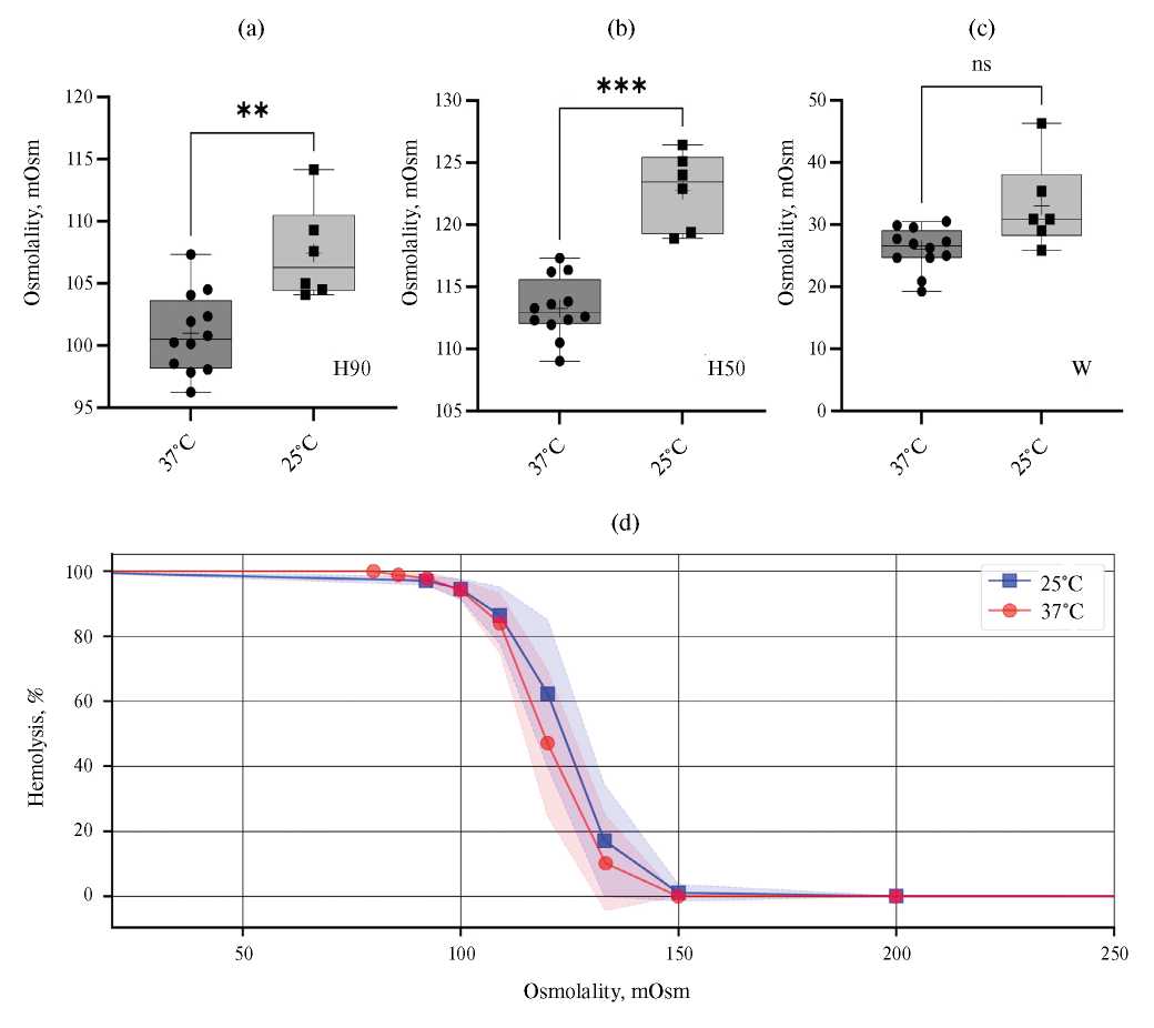 Рис. 4. Осмотическая резистентность эритроцитов человека при 25 и 37 °C. (a) — сравнение по H90. (b) — сравнение по H50. (c) — сравнение по W. Усы — минимум и максимум, n = 12 для 37 °C, n = 6 для 25 °C, + — среднее значение, ns — p > 0.05, ** — p < 0.01, ** — p < 0.001, Welch's t test. (d) — зависимости процента лизиса (Lys) в экспериментальных точках от осмоляльности среды (Osm). Полупрозрачное облако — стандартное отклонение (sd).