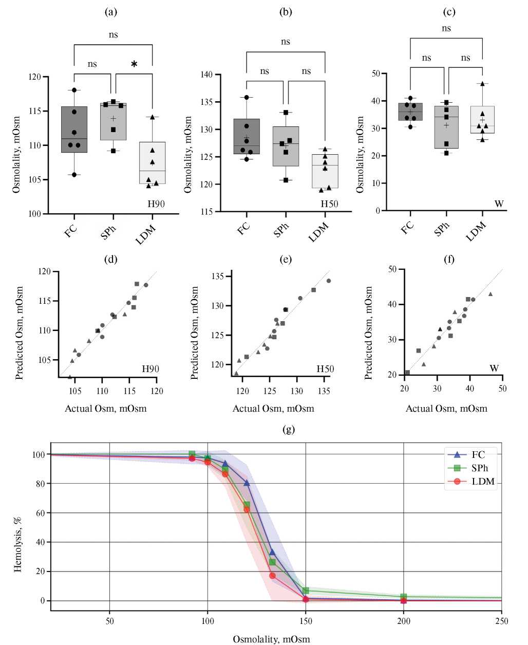 Рис. 5. Сравнение мануального метода лазерной дифракции с проточной цитометрией и спектрофотометрией при оценке осмотической резистентности эритроцитов человека. (a) — сравнение по H90. (b) — сравнение по H50. (c) — сравнение по W. FC — проточная цитометрия (n = 6), SPh — спектрофотометрия (n = 5), LDM — мануальный метод лазерной дифракции (n = 6), усы — минимум и максимум, + — среднее значение, ns — p > 0.05, * — p < 0.05, Tukey’s multiple comparisons test. (d) — QQ-plot для H90. (e) — QQ-plot для H50. (f) — QQ-plot для W. Predicted — квантили стандартного нормального распределения. (g) — зависимости процента лизиса (Lys) в экспериментальных точках от осмоляльности среды (Osm); полупрозрачное облако — стандартное отклонение (sd).