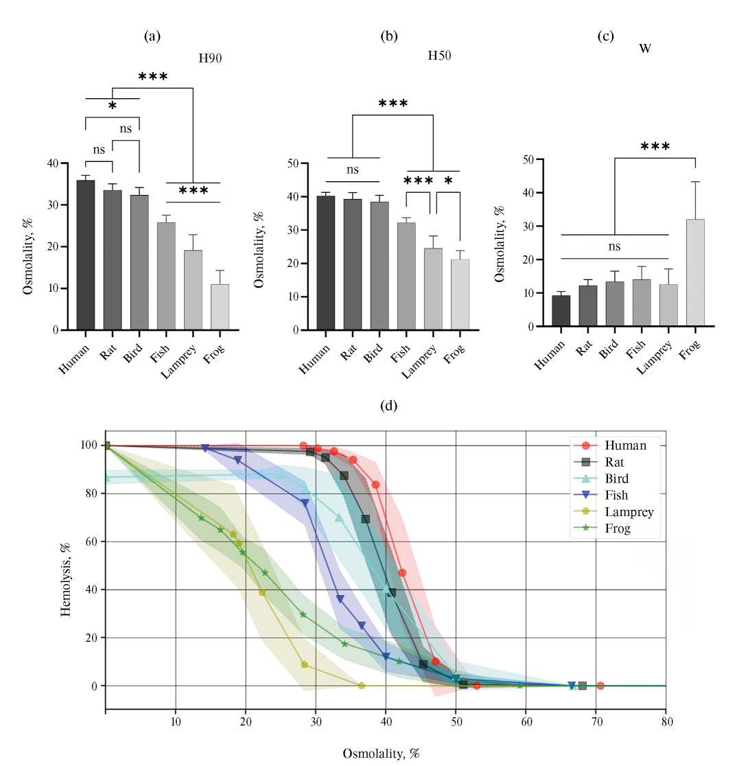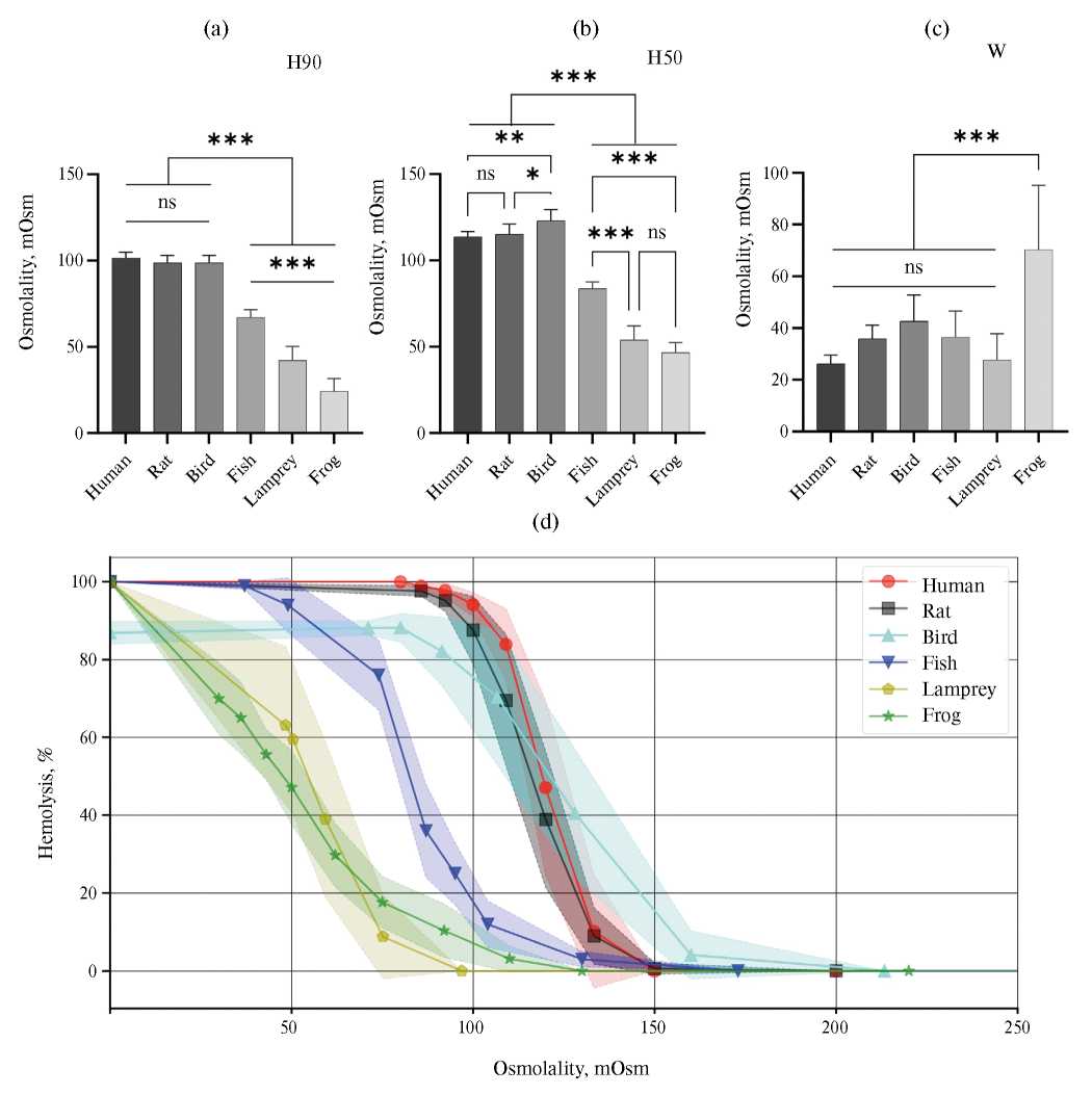 Рис. 8. Сравнение осмотической резистентности эритроцитов различных видов позвоночных. (a) — сравнение результатов по H90. (b) — сравнение по H50. (c) — сравнение по W. Температуры: 15°C для Lampetra fluviatilis (n = 30), 16°C для Carassius carassius (n = 12), 18°C для Rana ridibunda (n = 15), 41°C для Coturnix japonica domestica (n = 6) и 37°C для млекопитающих (n = 15 для Homo sapiens, n = 7 для Rattus norvegicus). Полупрозрачное облако — стандартное отклонение (sd). ns — p > 0.05, * — p < 0.05, ** — p < 0.01, *** — p < 0.001, Tukey’s multiple comparisons test. (d) — зависимости процента лизиса (Lys) от осмоляльности среды (Osm). Полупрозрачное облако — стандартное отклонение (sd). Использован мануальный метод лазерной дифракции.