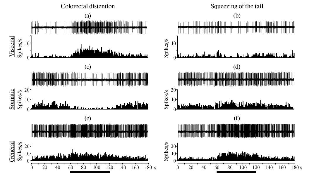 При висцеральном и соматическом болевых раздражениях изученные нейроны продолговатого мозга могли демонстрировать избирательноe возбуждение в ответ на один из стимулов и торможение или отсутствие реакции на другой, либо реагировать усилением активности на оба болевых воздействия (рис. 2). По особенностям ноцицептивных ответов они были разделены на нейроны висцерального, соматического и общего типа.