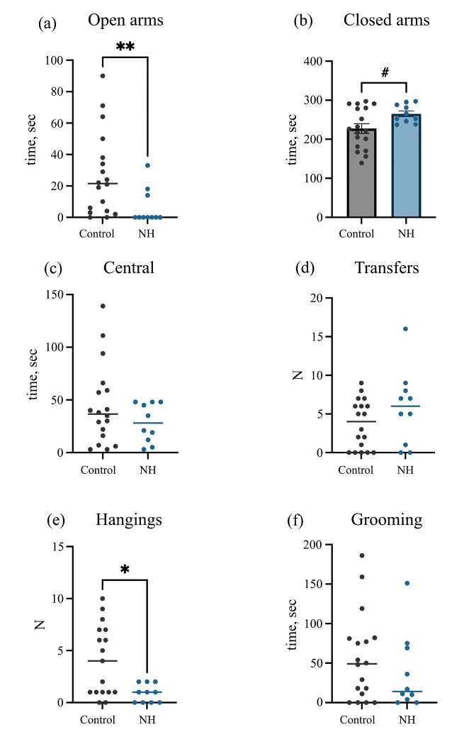 В тесте “приподнятый крестообразный лабиринт” НГ крысы отличались достоверным снижением времени, проведенным в открытых рукавах (рис. 5a, p = 0.005, Mann-Whitney test) и увеличением времени, проведенного в закрытых рукавах (рис. 5b, p = 0.04, Student t-test). Кроме того, НГ крысы демонстрировали меньшее количество свешиваний с открытых рукавов по сравнению с контролем (рис. 5e, p = 0.02, Mann-Whitney test), но не отличались по времени нахождения на центральной платформе (рис. 5c), количеству переходов между рукавами (рис. 5d) и времени, затраченном на груминг (рис. 5f).