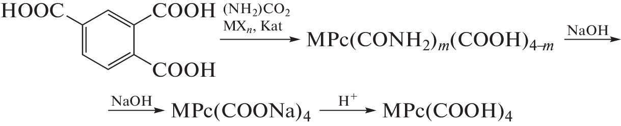 Complexes are obtained of tetra-4-carboxyphthalocyanines with copper and zinc that are insoluble in water. Standard enthalpies of formation of the compounds are calculated according to additive groups based on group systematics with a Benson-type classification of fragments that considers the influence of the primary environment of atoms. Thermal effects of the dissolution of crystalline tetra-4-carboxymetallo-phthalocyanines in aqueous solutions at different concentrations of KOH (0.002 to 0.02 mol/L) at 298.15 K are determined via direct calorimetry. The standard enthalpies of formation are calculated for products of the dissociation of complexes of tetra-4-carboxyphthalocyanines with copper and zinc in aqueous solutions.