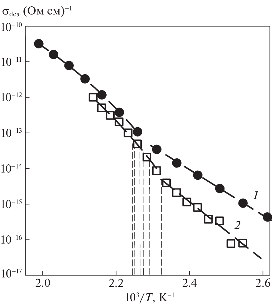A study is performed of the effect TiO2 nanoparticles have on the temperature dependence of the direct current conductivity of epoxy polymers. The value of direct current conductivity is determined by analyzing the frequency dependence of the complex permittivity in the 102–105 Hz range of frequencies. Two characteristic regions are found on the temperature dependence of direct current conductivity: the Vogel–Fulcher–Tammann dependence above the glass transition temperature (Tg), and the Arrhenius dependence below Tg, due apparently to a change in the mechanism of conduction after the freezing of ionic mobility at temperatures