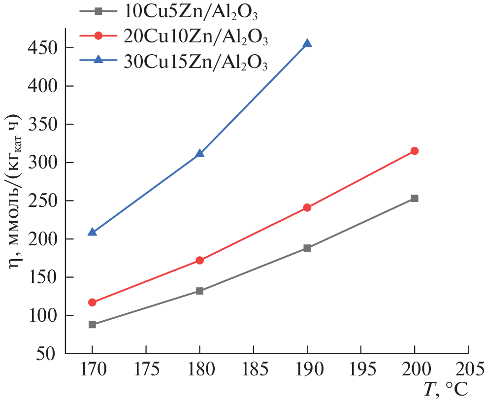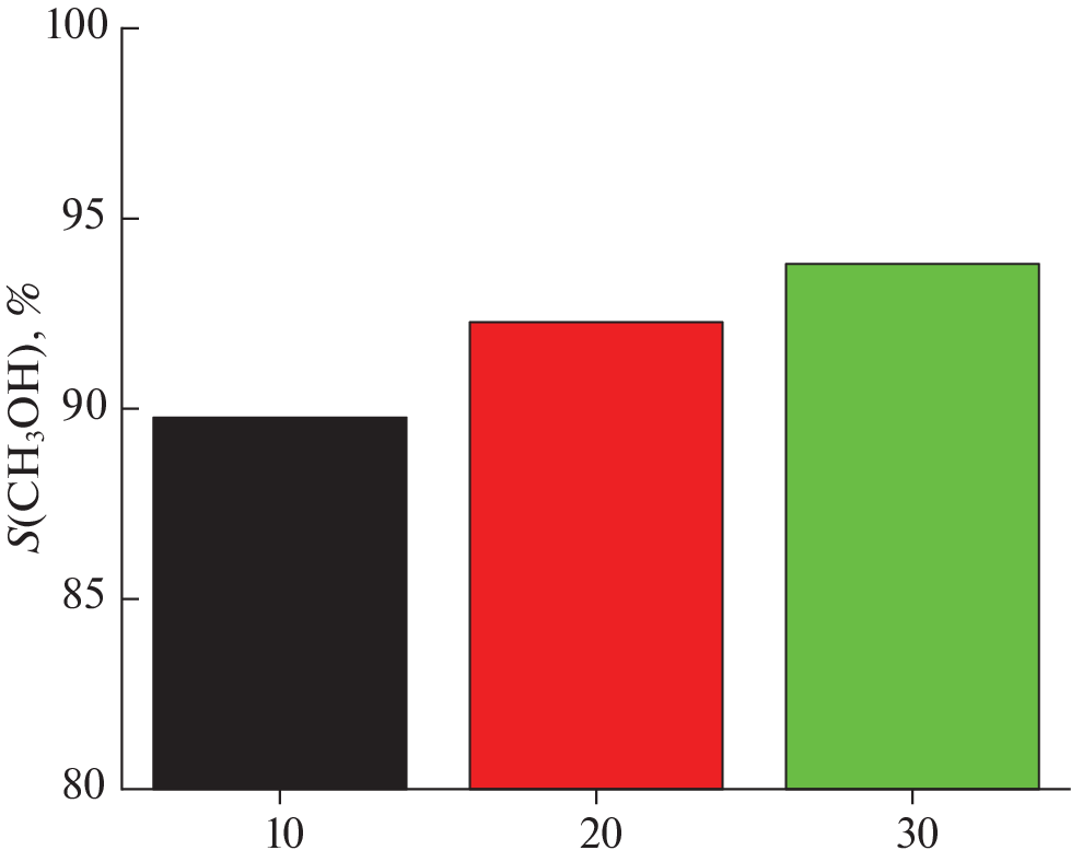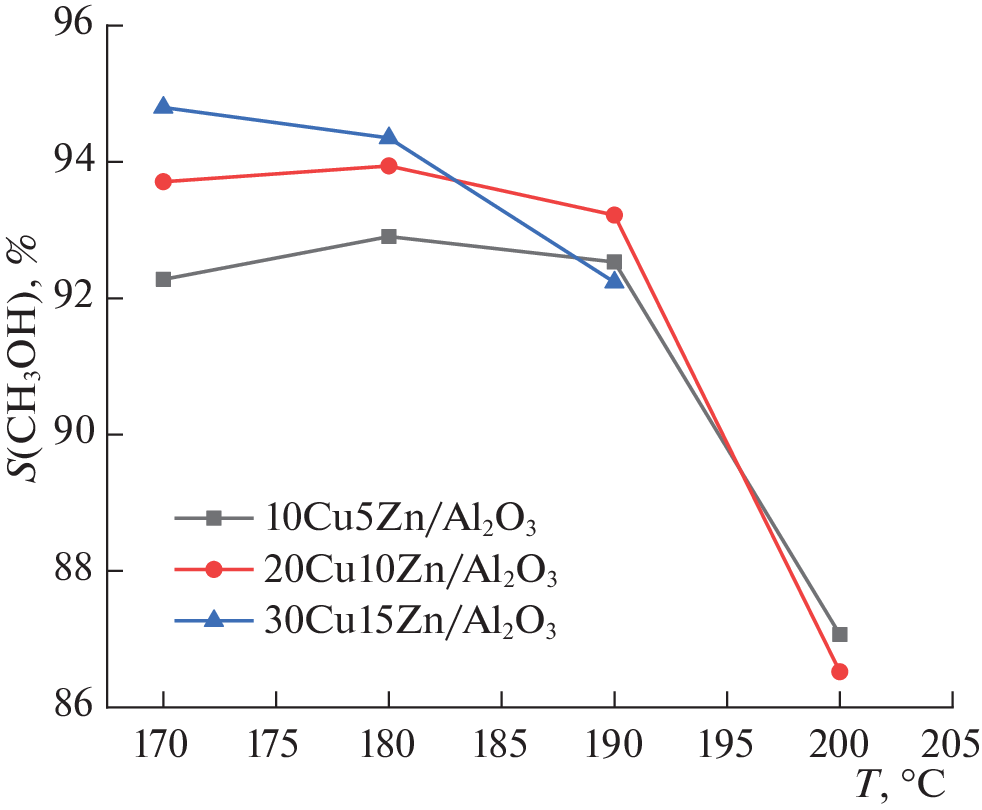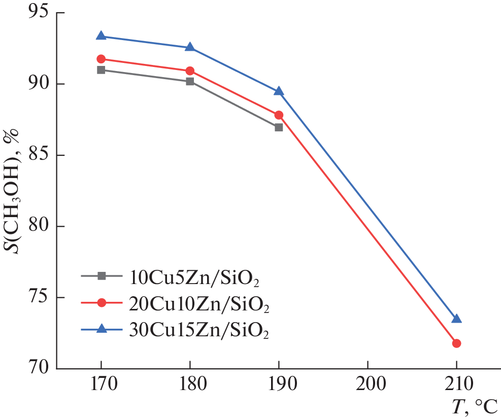 A study is performed of the catalytic properties of Cu–Zn catalysts on Al2O3 and SiO2 supports (Acros) in the reaction of CO2 hydrogenation to obtain methanol. A sample of 30Cu15Zn/Al2O3 displays great selectivity toward methanol. A sample of 30Cu15Zn/SiO2 has the highest methanol performance. The methanol performance of a sample of 10Cu5Zn/Al2O3 is doubled when the pressure is raised from 10 to 30 atm, and a 94% increase in selectivity is observed. A sample of catalyst 10Cu5Zn/SiO2 does not lose its activity after 10 h of a catalytic reaction, and its methanol performance grows with repeated use