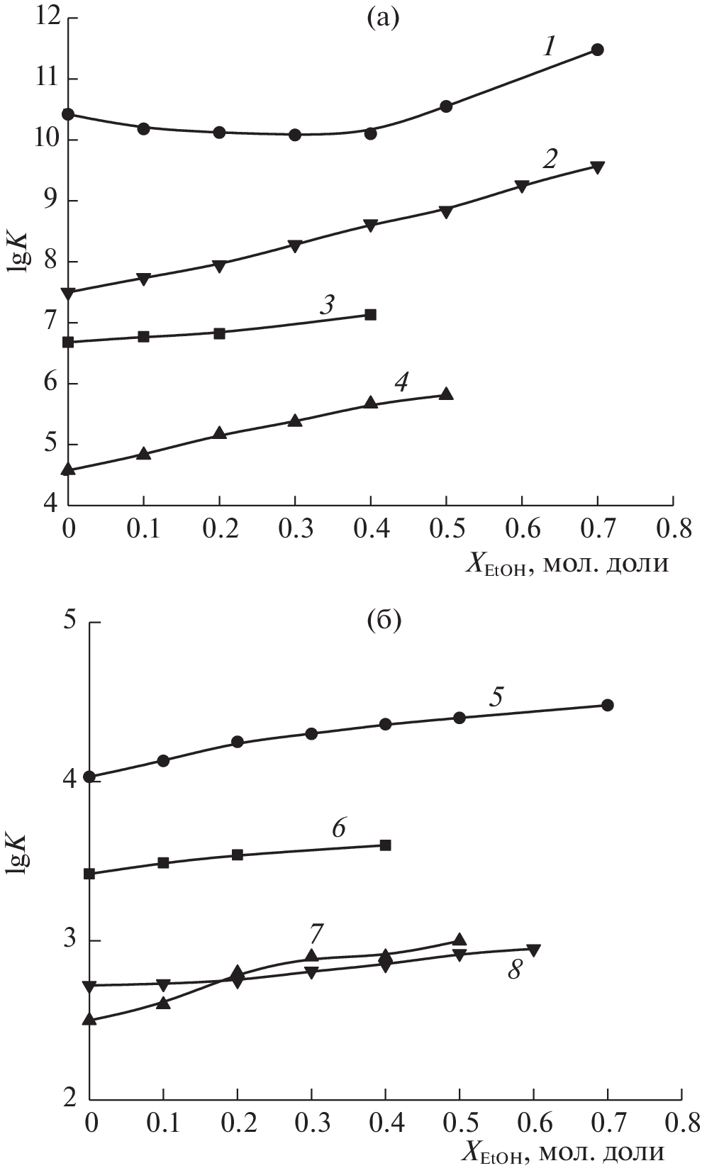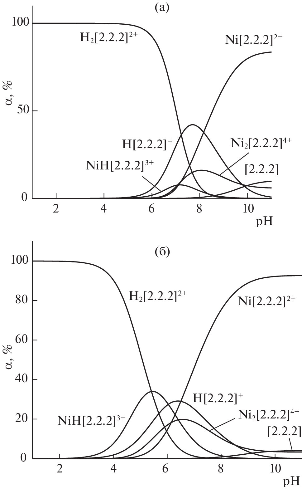 The stability constants of nickel(II) complexes with [2.2.2]cryptand in aqueous ethanol solutions with a variable concentration of the organic co-solvent were determined by potentiometry at Т = 298 K and µ → 0. It was found that mononuclear, binuclear, and protonated nickel(II) cryptates can form in solution, whose stability increases with the ethanol content. The Gibbs energies of nickel(II) ion transfer from water to the aqueous ethanol solvent were calculated using published data. The contributions of resolvation of reagents in water–ethanol mixtures to the change in the stability of nickel(II) complexes with [2.2.2]cryptand were evaluated.