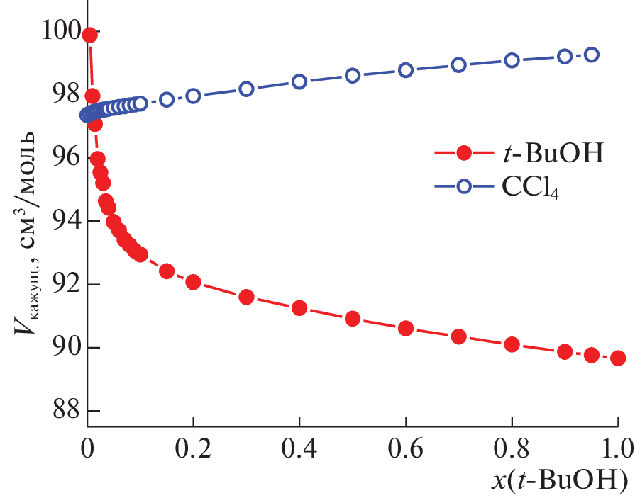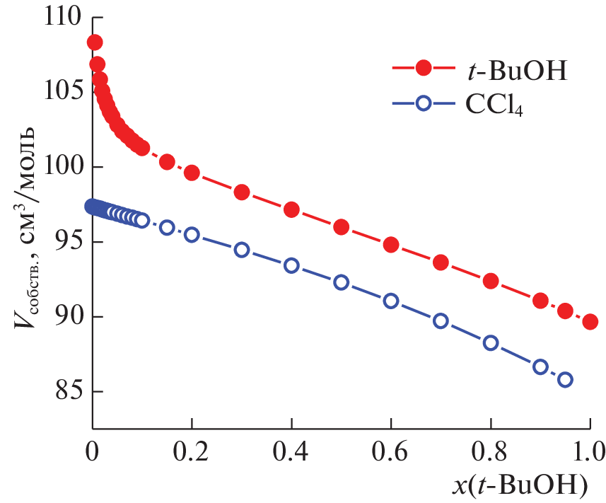 Models of solutions of tert-butyl alcohol (TBA) in carbon tetrachloride (CTC) are obtained via all-atom molecular dynamics modeling. The excess volume of the solution and the apparent and intrinsic (geometric) volumes of both components are calculated throughout the range of concentrations. It is shown that the apparent and intrinsic molar volumes of TBA in the limit of low concentrations in solution are notably larger than in pure alcohol. At the same time, their values fall rapidly in a narrow range of concentrations (from 0 to 0.1 mole fractions), and then move almost linearly to their limit values in alcohol. It is found that such behavior of the volumetric characteristics of TBA is due to the specific association of alcohol at low concentrations because of the hydrogen bonding among TBA molecules.