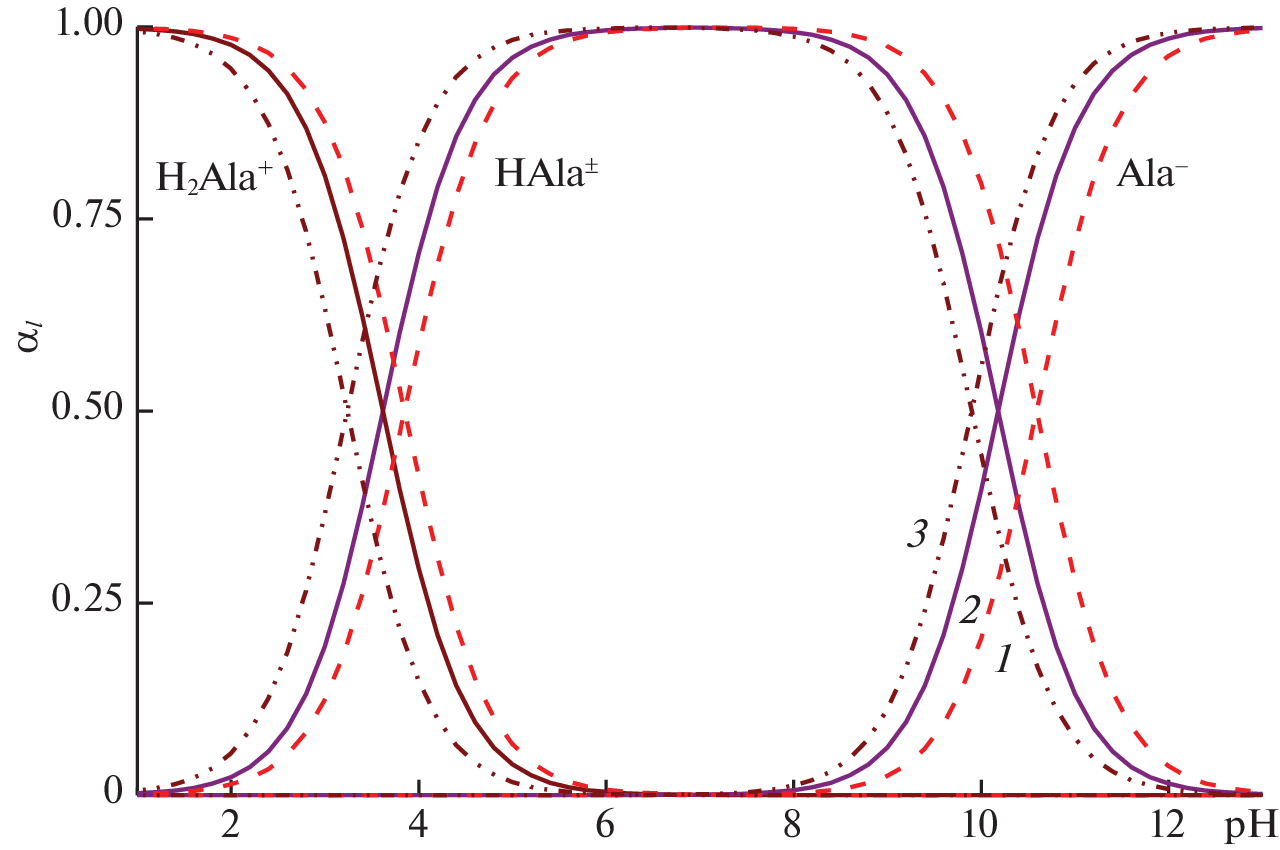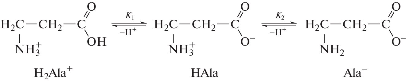 The acid–base properties of β-alanine (β-Ala) in aqueous solution were studied by the pH-metric method in the temperature range 278.2–318.2 K and at I = 0.1 M KCl. The ionization constants (pKi) of β‑Ala at different temperatures were calculated. The ionization constants were found to change depending on the temperature: an increase in the temperature leads to a decrease in pKi for both carboxyl and amine groups, which indicates that the degree of ionization of β-alanine increased and its acidic properties were enhanced. The thermodynamic characteristics (ΔН0, ΔS0, and ΔG) of the corresponding ionization processes were determined by the temperature coefficient method.