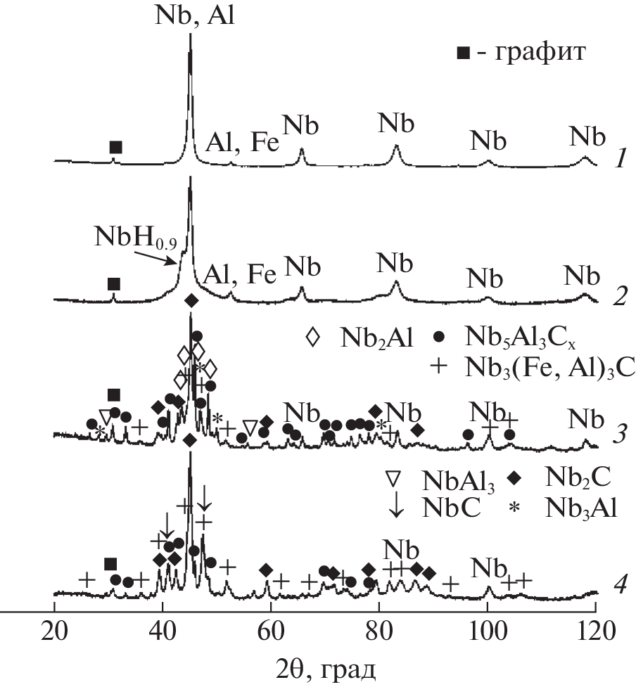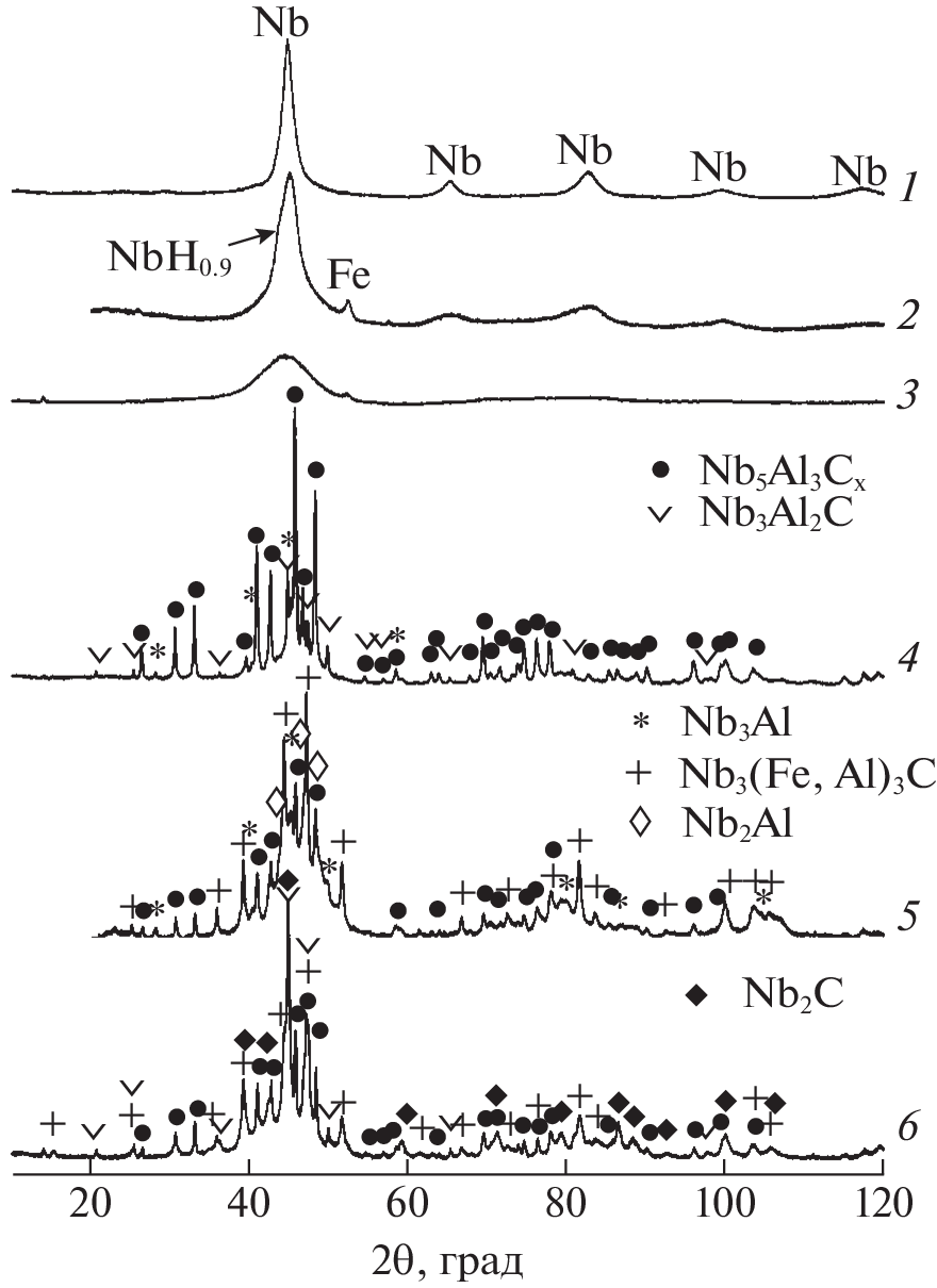 The η-carbide Nb3(Fe,Al)3C phase was synthesized for the first time by mechanical alloying of Nb, Al, and Fe in petroleum ether followed by annealing. The synthesis of carbide occurs due to carbon accumulated from the grinding medium. If mechanical alloying is performed using steel vials and balls, the composites based on η-carbide can be obtained without additional introduction of iron; contaminant iron is involved in the formation of Nb3(Fe,Al)3C.