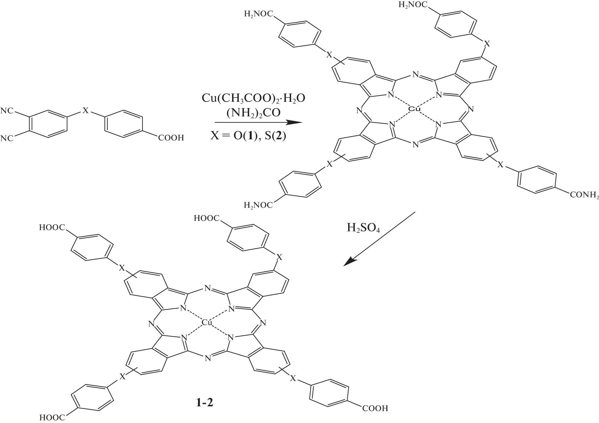 The authors obtain complexes CuPc(4-S-C6H4-COOH)4 and CuPc(4-O-C6H4-COOH)4 that are insoluble in water. The standard enthalpies of formation of these compounds are calculated using additive groups based on group systematics with Benson-type classification of fragments, allowing for the influence of the atoms’ primary environment. Thermal effects of the dissolution of crystalline phthalocyanines in aqueous solutions of various KOH concentrations at a temperature of 298.15 K were determined via direct calorimetry. Thermal effects of the stepwise dissociation of CuPc(4-S-C6H4-COOH)4, CuPc(4-O-C6H4-COOH)4 are calculated using the HEAT computer program. Standard enthalpies of formation are calculated for products of the dissociation of CuPc(4-S-C6H4-COOH)4 and CuPc(4-O-C6H4-COOH)4 in an aqueous solution.