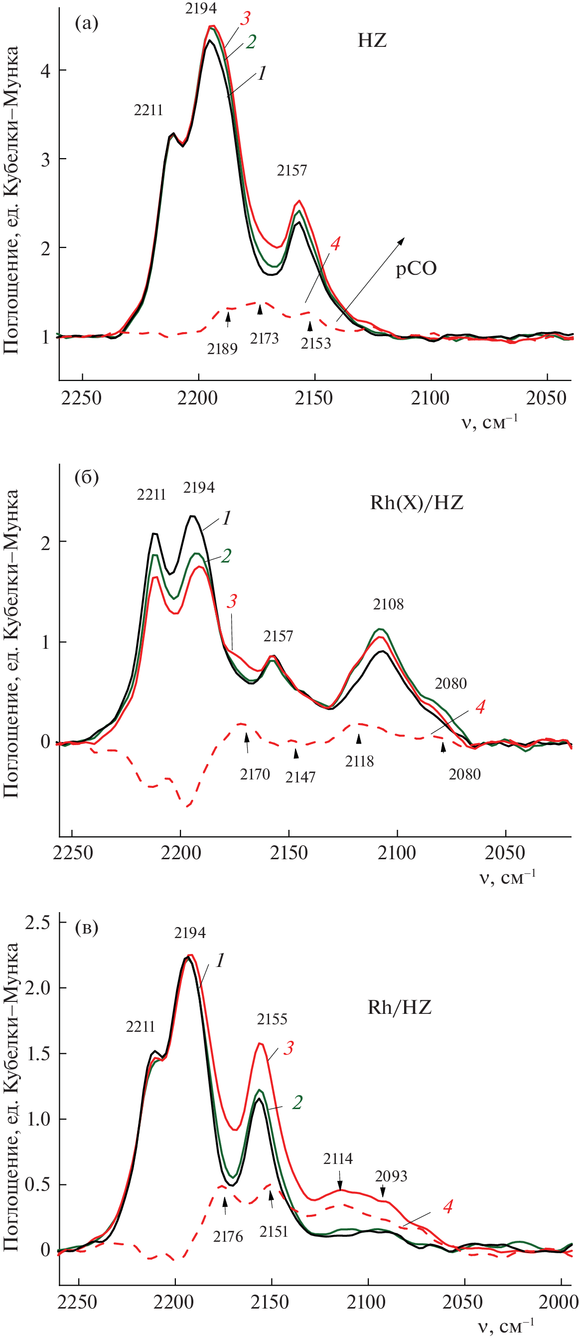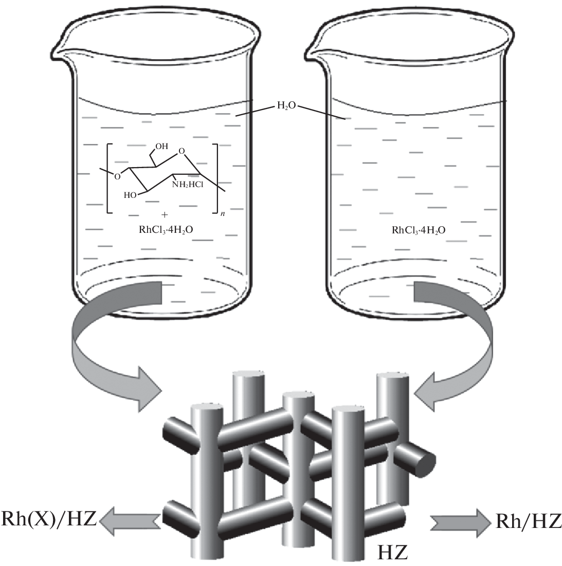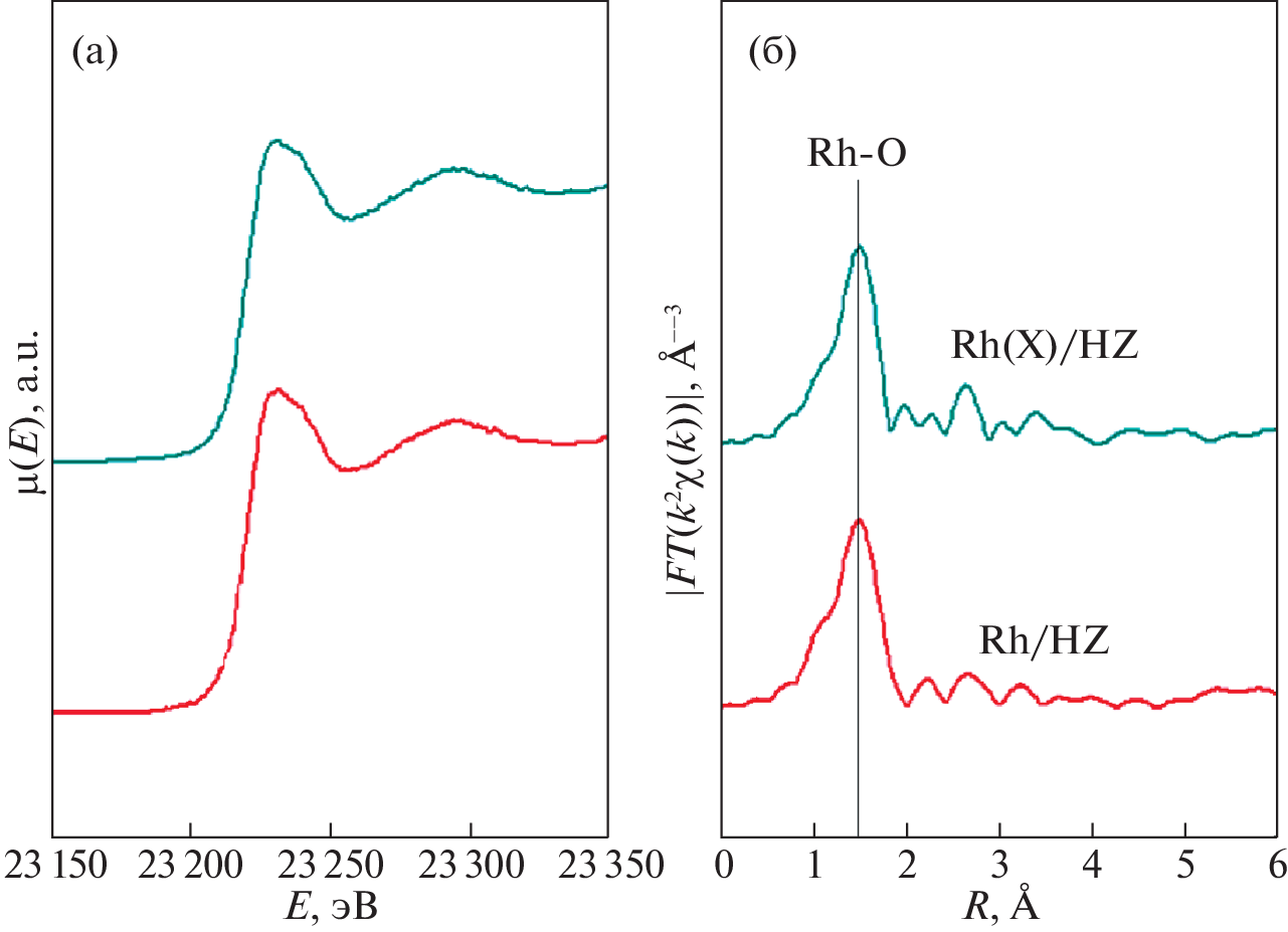 Zeolite catalysts for the conversion of dimethyl ether to light olefins with a monoatomic distribution of rhodium are studied via infrared spectroscopy of the diffuse reflection of adsorbed carbon monoxide and X-ray absorption spectroscopy. The zeolite is preliminarily treated with ultrasound to obtain a monatomic distribution of the active component on the support’s surface, and a polymer (chitosan hydrochloride) is used as the medium for dispersing rhodium at the stage of impregnation. A sample prepared via the traditional impregnation of zeolite with an aqueous solution of rhodium chloride is studied for purposes of comparison. It is shown that rhodium in the structure of zeolite treated with ultrasound is in the form of isolated metal centers whether it is deposited with or without a polymer. Synthesis with chitosan results in a more disperse distribution of rhodium on the outer surface of the zeolite and greater oxidizing ability of the catalyst.