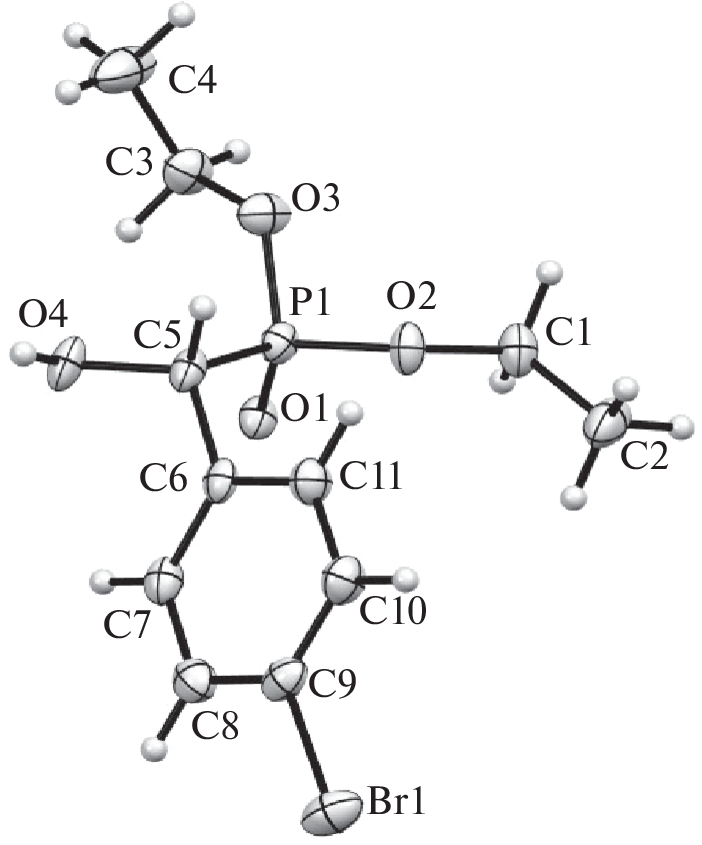 Two series of α-hydroxyphosphonate synthesis according to the Abramov reaction are conducted under conditions of microwave activation. Acidic and basic catalysts are used along with 4-bromobenzaldehyde and 3-methoxy-4-hydroxybenzaldehyde. O,O-Diethylphosphite is used as a phosphorylating agent. The conversion of the reaction products is monitored via NMR spectroscopy. The optimum conditions for the synthesis of α-hydroxyphosphonates are selected. The crystal structure of reaction product O,O‑diethyl((4-bromophenyl(hydroxy)methyl)phosphonate 2, which crystallizes in the space group P21/n and is stabilized by multiple C–H⋅⋅⋅O and C–H⋅⋅⋅π interactions, is described for the first time.