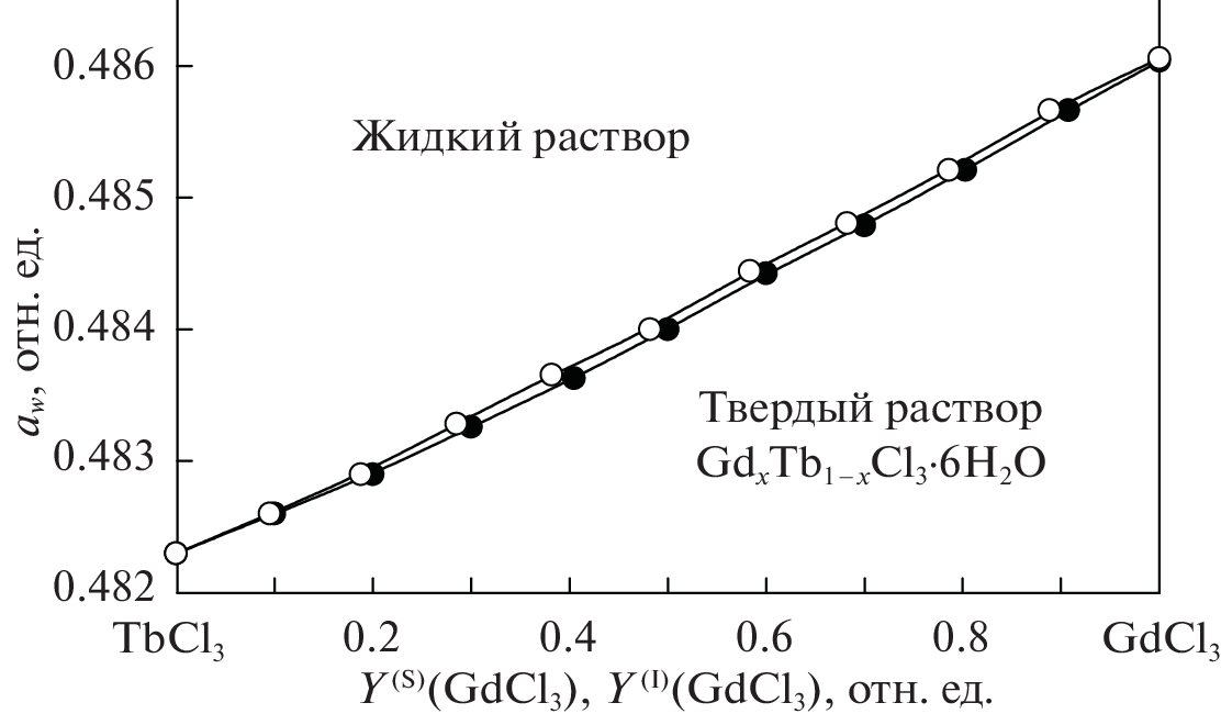 Методом изотермического насыщения в ампулах изучена диаграмма растворимости трехкомпонентной системы GdCl3–TbCl3–H2O при 25°С. В системе кристаллизуется непрерывный ряд твердых растворов изовалентного замещения \({\text{G}}{{{\text{d}}}_{x}}{\text{T}}{{{\text{b}}}_{{1 - x}}}{\text{C}}{{{\text{l}}}_{3}}\, \cdot \,6{{{\text{H}}}_{2}}{\text{O}}.{\text{\;}}\) Проведен расчет диаграммы растворимости в трехкомпонентной системе GdCl3–TbCl3–H2O при 25°С по классическому методу Питцера. Результаты эксперимента убедительно согласуются с результатами термодинамического моделирования.