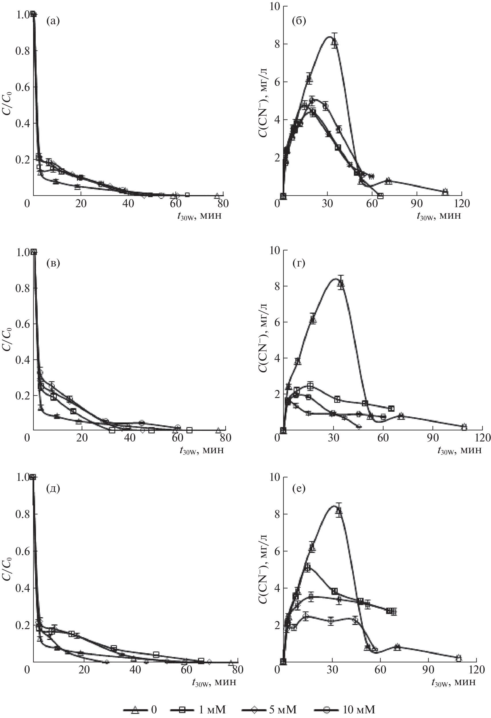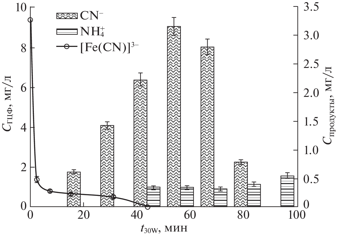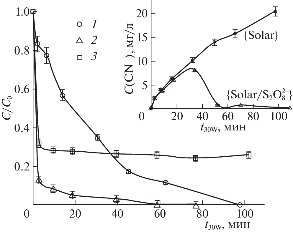 The main kinetic laws governing the photochemical degradation of stable cyanide compounds are studied using the example of hexacyanoferrates (HCFs) in the combined {Solar/S2O2−882−} oxidation system under the action of solar radiation. The efficient oxidation of intermediate products (toxic free cyanides) to nontoxic final products proceeds in the combined {Solar/S2O2−882−} system, in addition to the complete degradation of [Fe(CN)6]3− complex. The high efficiency of HCFs oxidation in the combined system is attributed to a conjugated ion-radical mechanism that includes (along with direct photolysis) oxidation with the participation of highly reactive oxygen species (ROSes)—reactive secondary oxidizing agents consisting mostly of hydroxyl radicals generated in situ during the simultaneous alkali and light activation of persulfate with solar radiation. The effect anions (chlorides, sulfates, bicarbonates) and associated organic pollutants (xanthates, phenol) most characteristic of cyanide-containing industrial wastewater have on HCF oxidation in the {Solar/S2O2−882−} system is studied. The studied anions promote HCF photochemical oxidation in a wide range of concentrations (1–10 mM).
