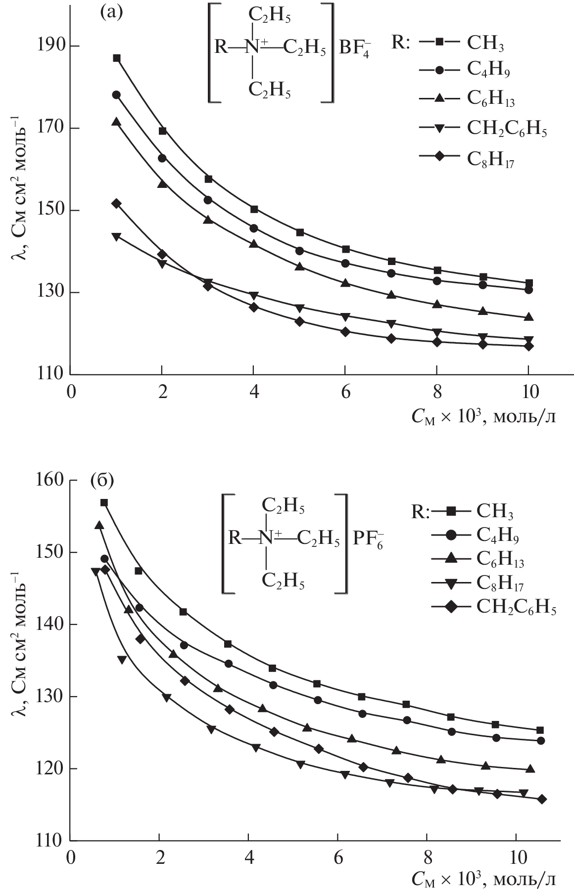 A study is performed of the electrical conductivity (EC) of ionic liquids based on quaternary triethylalkylammonium salts with tetrafluoroborate and hexafluorophosphate anions in acetonitrile. Conductometric data on these compounds are analyzed. Constants Ka of the ionic association of the limiting molar electrical conductivity (λ0) and the standard Gibbs energy of association (ΔG0) in solutions are calculated using the Lee–Wheaton formula. The Stokes radii, limiting mobility, and limiting coefficients of diffusion are found for tetraalkylammonium cations.
