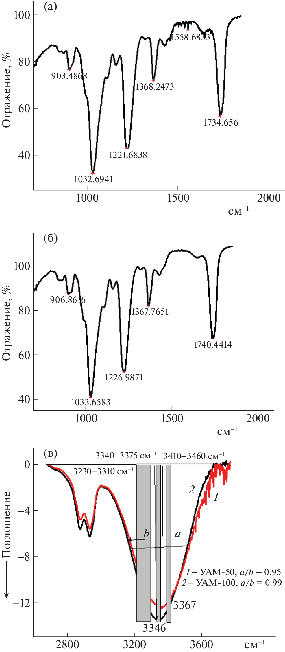 It is established that the fractions of the characteristic intensities of OH group vibrations attributed to intramolecular H-bonds of O3–H···O5 and O2–H···O6 types and intermolecular H-bonds of O6–H···O3 type of air-dried samples are 0.12, 0.1, and 0.2 for UAM-100 membrane and 0.12, 0.1, and 0.19 for UAM-50 membrane. It is shown that the characteristic intensity of the ν(OH) absorption band grows from 9.55 to 10.3 in a working sample of the UAM-100 membrane and a drop in the symmetry index to 0.75 was explained by the oxidation of aldehyde groups at C1 pyranose ring to the carboxyl (–COOH). It is proved that the fractions of intermolecular bonds of О6–Н···О3 and intramolecular H-bonds of O3–H···O5 and O2–H···O6 are 0.15, 0.09, and 0.13 that indicates not only the structural rearrangement of the hydrogen bond system but also possibly the formation of weak hydrogen bonds between hydroxyl groups of pyranose rings and molecules of the sedimentary layer.