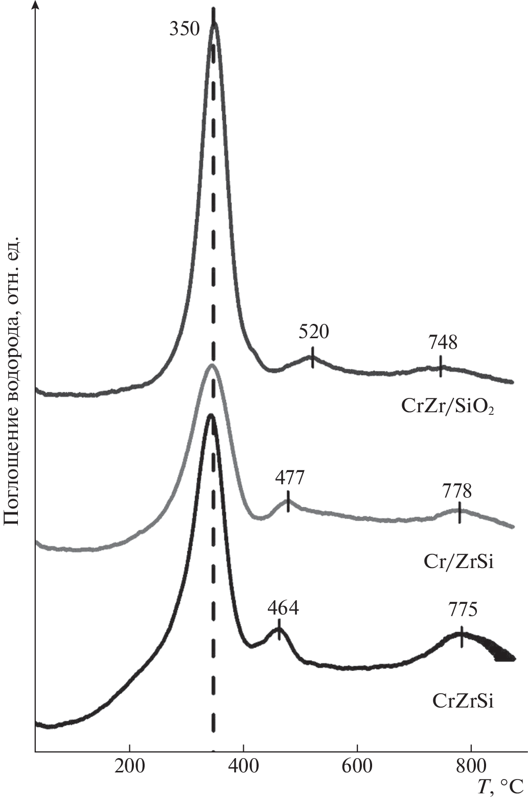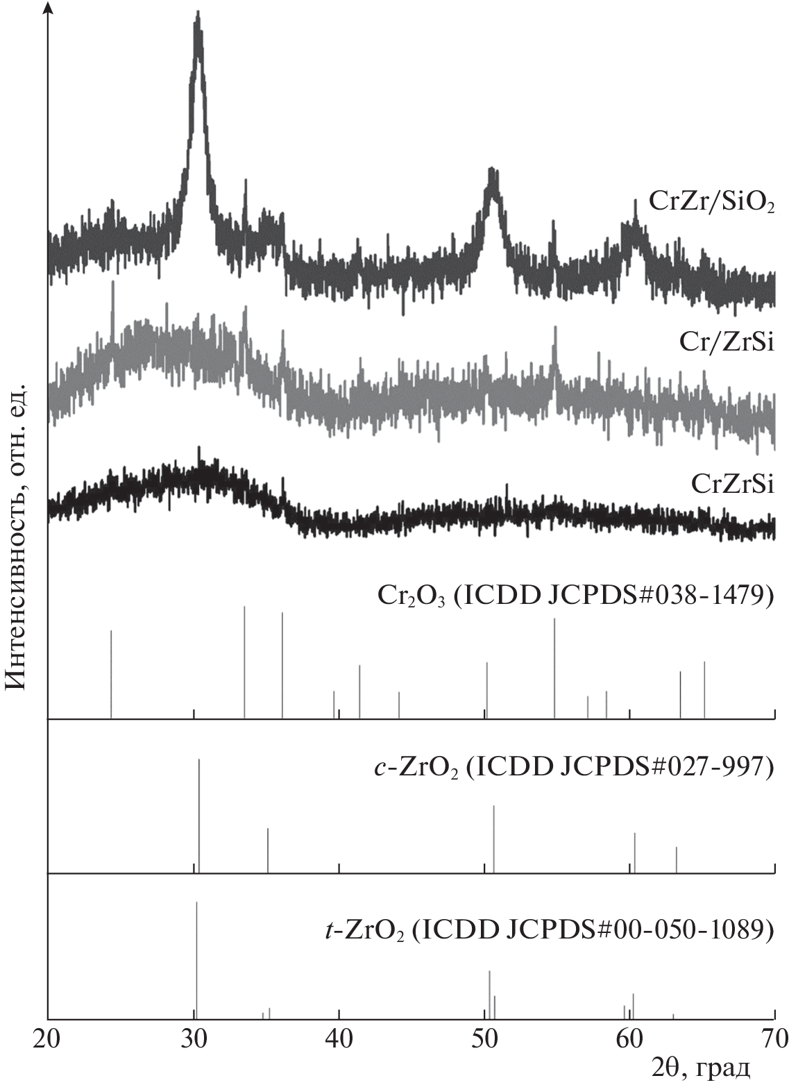 Проведено сравнение катализаторов CrOx–ZrO2–SiO2 (9 мас. % оксида хрома (в расчете на Cr2O3), мольное отношение (Cr + Zr)/Si = 0.8), полученных варьированием порядка введения компонентов: (1) одновременное осаждение всех компонентов; (2) нанесение CrOx на ZrO2–SiO2 методом пропитки; (3) совместное осаждение CrOx и ZrO2 на SiO2. В качестве предшественника SiO2 в методах (1) и (2) использовали ТЭОС, в методе (3) применяли SiO2, полученный прокаливанием рисовой шелухи. Катализаторы протестированы в реакции неокислительного дегидрирования пропана в проточной системе с неподвижным слоем катализатора при 500–600°С. Совместное осаждение CrOx и ZrO2 обеспечивает высокую эффективность катализаторов. При 500 и 550°С наиболее эффективен CrZr/SiO2, полученный осаждением CrOx и ZrO2 на SiO2; при 600°С лучше работает катализатор CrZrSi, полученный одновременным осаждением всех компонентов. Методами СЭМ-ЭДА, РФА, ТПВ-Н2 и КР-спектроскопии показано, что в катализаторах, полученных совместным осаждением CrOx и ZrO2, эти компоненты, образующие активные центры, равномерно распределены, тесно контактируют и хорошо диспергированы, а Cr6+ легко восстанавливается водородом реакционной среды до Cr3+.