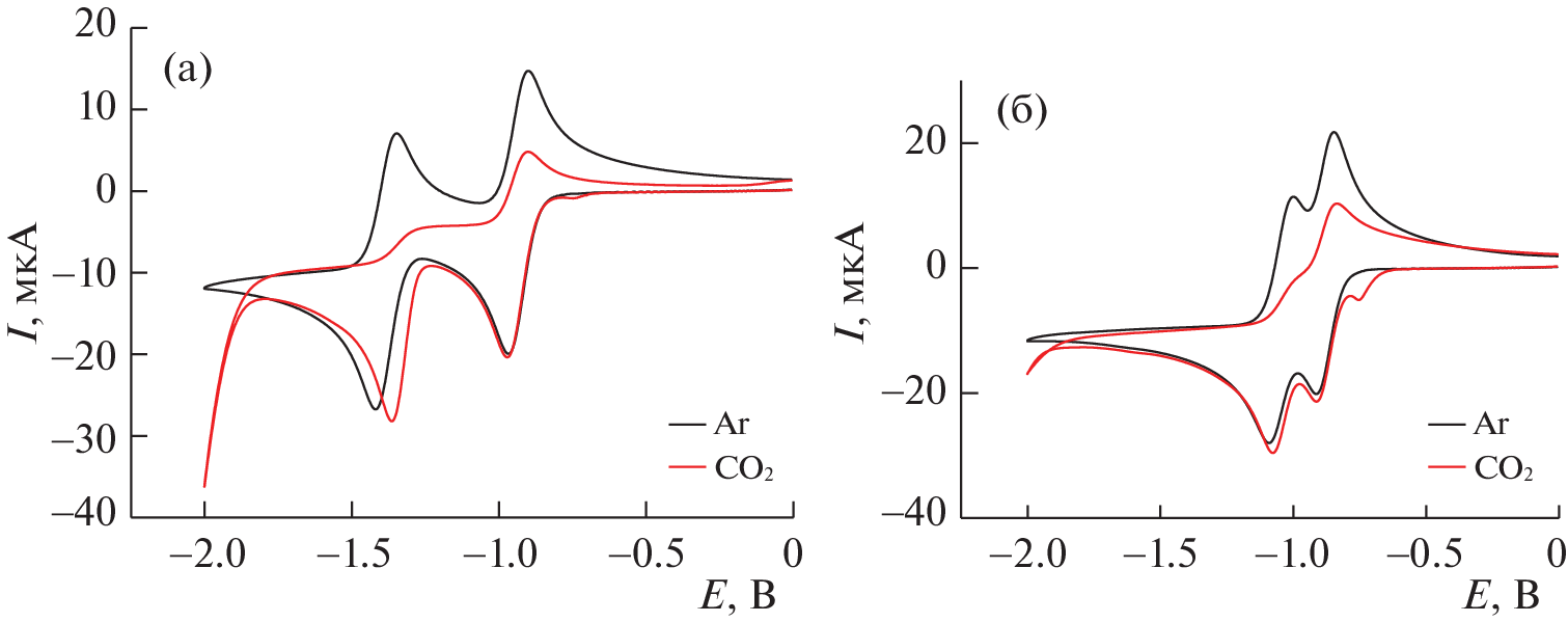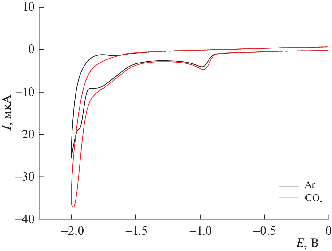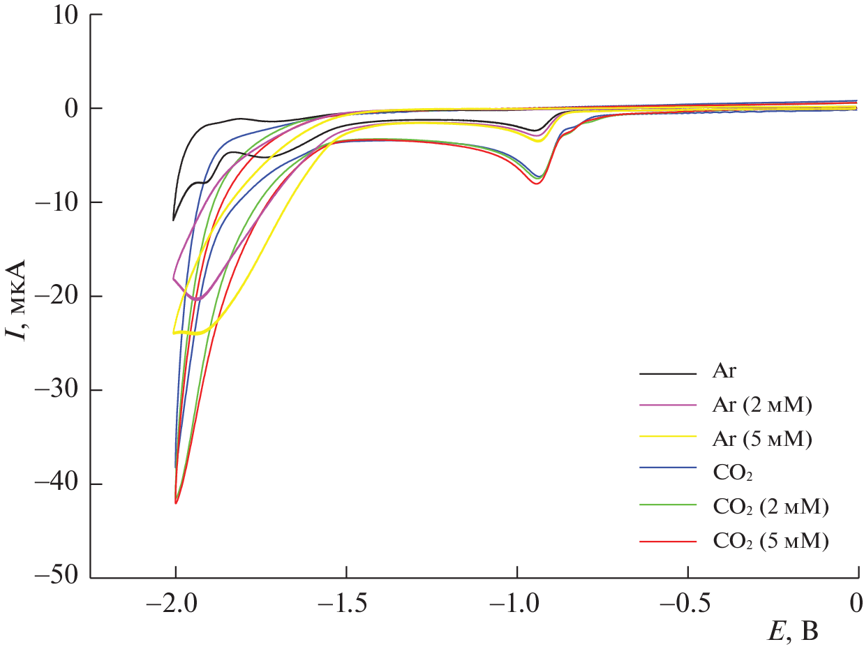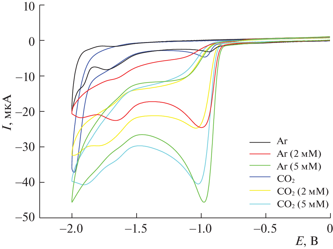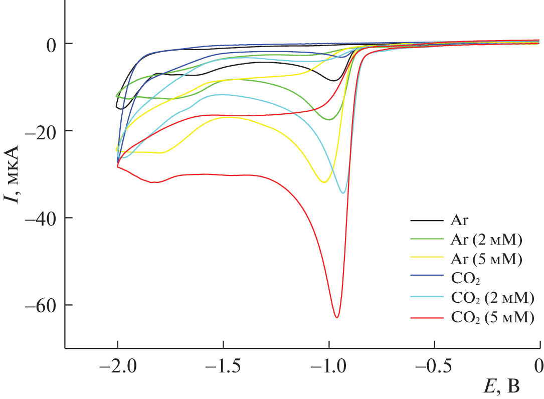 A study is performed of the electrocatalytic activity of substituted pyridine salts (N-hydro-, N‑methyl-, and N-phenyl-2,4,6-triphenylpyridinium perchlorates) in the electroreduction of carbon dioxide to carbon monoxide. The effect the natures of the substituent and the H+ source have on the efficiency of the process is determined. The main reasons for the occurrence of the electrocatalytic process are identified, and the values of TOF (catalyst speed) and TON (number of revolutions of the catalyst) are calculated. It is shown that the values of TOF and TON fall as the pK of the acid rises.