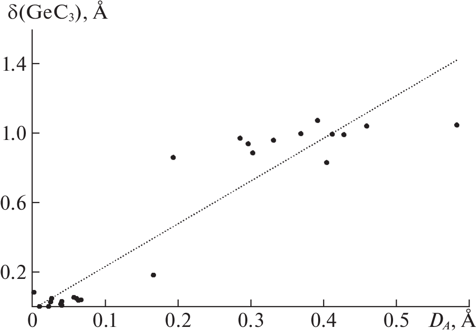 A crystal-chemical analysis has been performed for germanium compounds whose structure includes GeCn coordination polyhedra using the intersecting sectors method and Voronoi–Dirichlet polyhedra. In the structures of organogermanium compounds, the germanium atoms have coordination numbers of 2–6 and 10 with respect to the carbon atoms. The influence of the coordination number and oxidation state of germanium atoms on the main characteristics of their Voronoi–Dirichlet polyhedra (VDP) was considered. The existence of a single linear dependence of the solid angles of VDP faces corresponding to valence and nonvalence Ge–C and Ge⋅⋅⋅C contacts on the corresponding internuclear distances was established. A stereo effect of the lone pair of electrons of Ge(II) atoms in the GeCn complexes (n = 2–6 or 10) found; it manifests itself as a displacement of the nuclei of Ge(II) atoms from the centers of gravity of their VDPs (0.15–0.58 Å) and as asymmetry of the coordination sphere. The deviation of the GeC3 complexes from planar geometry in the crystal structures was shown to be directly proportional to the displacement of the nuclei of Ge atoms from the centers of gravity of their VDP.
