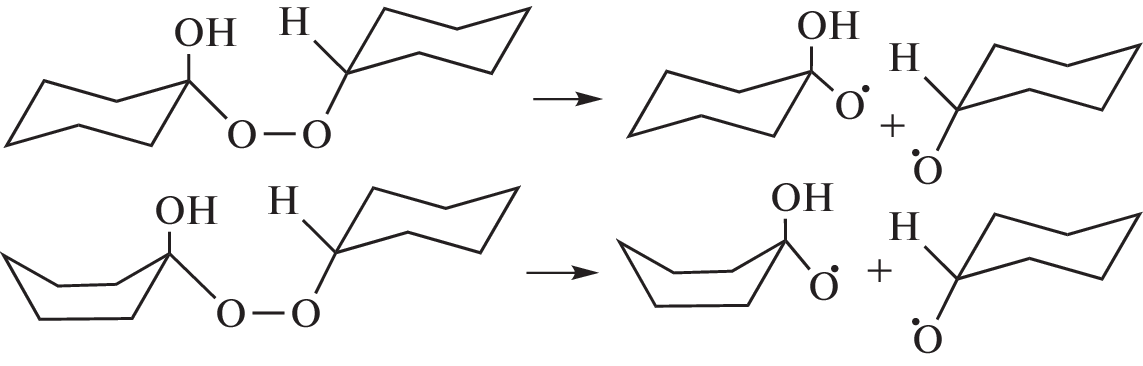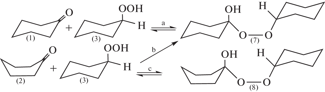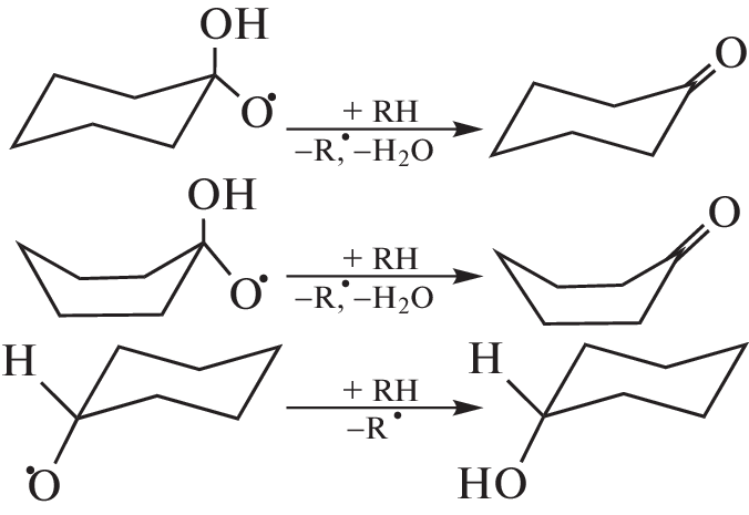 The B3LYP/6-311g++(d,p), G3, and CBS-QB3 methods (DFT) have been used to calculate the free energy and equilibrium constants of the “chair”–“boat” conformational transition of cyclohexanone in the temperature range 298.15–428.15 K. The equilibrium composition of the chair and boat conformers of cyclohexanone has been calculated. It has been shown that with an increase in the proportion of the boat conformation, the selectivity of the process of cyclohexane oxidation to cyclohexanone decreases. The transition states of addition reactions of cyclohexyl hydroperoxide at the carbonyl group of cyclohexanone for chair and boat conformations have been found by the QST2 method. The energy profiles of these reactions have been calculated. It has been established that the addition of hydroperoxide to the carbonyl group of the boat conformation of the ketone is accompanied by a transition to the chair conformation.