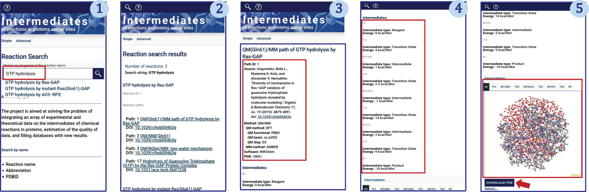Enzymatic catalysis is characterized by multistage chemical reactions from enzyme-substrate complexes to products. In a number of cases, in the course of experimental studies, it is possible to characterize the structures and properties of intermediates of complex chemical reactions in proteins. The use of modern computer simulation methods makes it possible to significantly supplement the knowledge of the mechanisms of enzymatic catalysis reactions and provide detailed data on reaction intermediates, including structures with atomic resolution. The materials accumulated to date make it possible to create a unique dat-abase called ENIAD (ENzyme-In-Action-Databank). The article describes the principles of building the ENIAD database, as well as a multiplatform web interface for accessing data (https://lcc.chem.msu.ru/eniad/).