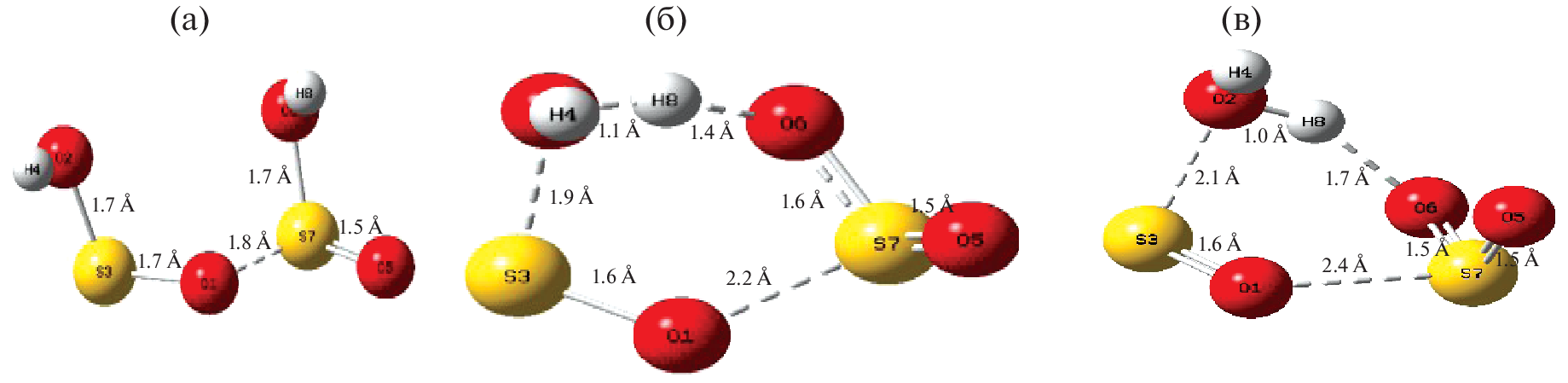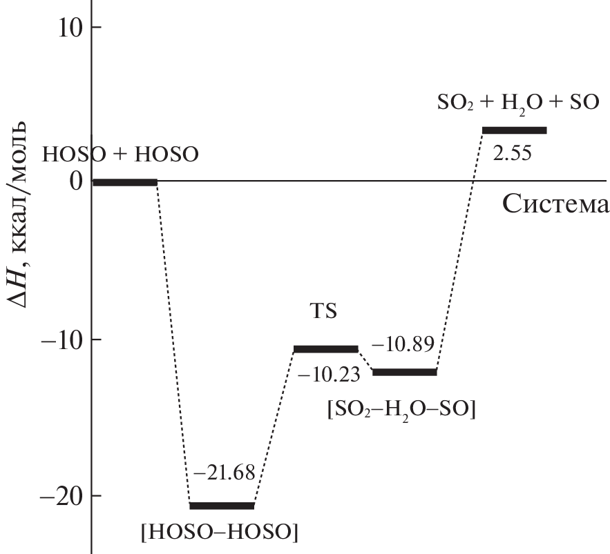 An experimental study is performed of the mechanism of sulfur dioxide–hydrogen interaction (4Н2 + 2SО2 → S2 + 4H2О) at temperatures of 623, 673, 723, and 773 K and a pressure of 198 Torr. The mechanism is analyzed via mathematical modeling. It is found to be a chain reaction of hydrogen oxidation with sulfur dioxide, which results in the formation of molecular sulfur (S2). The process is characterized by negative Gibbs free energy ΔG723 = −49.950 kcal/mol. The potential energy surface of the (HOSO + HOSO) system is studied by various means of quantum chemistry, and the thermodynamic parameters of the НОSO + НОSO → SO + SO2 + Н2О reaction are determined. A new mechanism of the reaction, supplemented by elementary acts, is discussed. Good agreement is found between energies of activation determined experimentally and calculated using data from our numerical kinetic analysis.