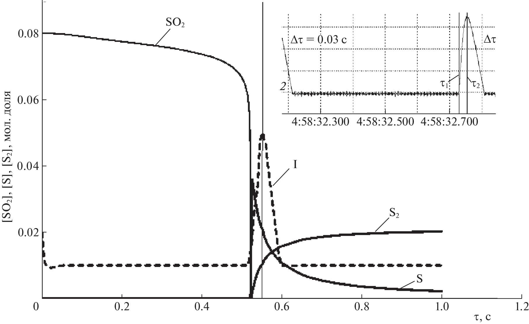 Реакция окисления водорода в присутствии сернистого газа в области самовоспламенения (Т = = 470–510°C и Р < 200 Торр) сопровождается образованием элементарной серы, которая протекает во взрывном режиме. В работе расчетно-кинетическим методом с помощью программы SENKIN: CHEMKIN II, на математической модели, описывающей процесс окисления водорода в присутствии сернистого газа, проанализированы наблюдаемые вспышки светового излучения взрывного процесса. Выявлены характеристики процесса окисления водорода в присутствии сернистого газа в области низкотемпературного цепного взрыва.