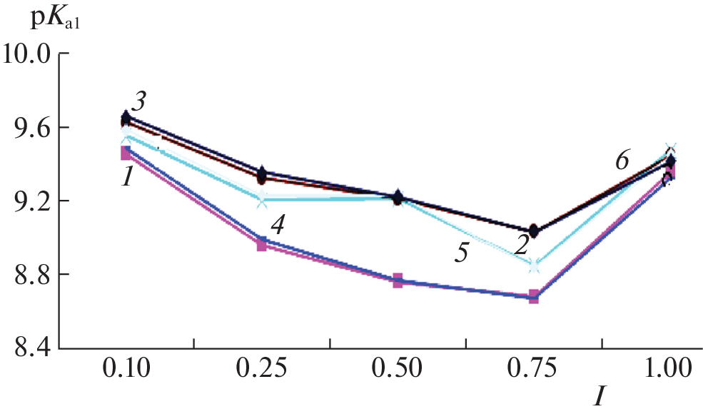 Processes of alanine ionization are studied via potentiometry at a temperature of 298.15 K and different ionic strengths of a NaHClO4 solution. Constants of the acid’s thermodynamic ionization are calculated at three concentrations of alanine. Different empirical and semi-empirical equations are used to calculate the coefficients of ionic activity in terms of the second and third approximations of the Debye–Hückel theory. Values of pKa1 and pKa2 are calculated at 298.15 K, solution ionic strengths of 0.1, 0.25, 0.5, 0.75, and 1.0 mol/L, and concentrations of 1.0 × 10−3–3.0 × 10−3 mol/L with a confidence level of P = 0.95.