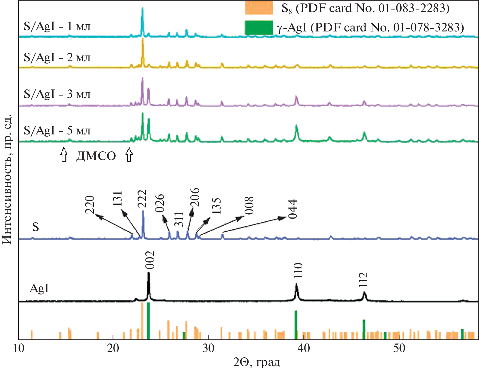 Transformations in the S–AgNO3–NH4X–NH4NO3 (X = Cl, Br, I) system show that nanoparticles and nanocomposites with a controlled size of particles and content of components can be synthesized via mechanical treatment and adding small amounts of a liquid in which the precursors are soluble. Nanoparticles form in a dimethyl sulfoxide (DMSO) medium through conventional (continuous dissolution–crystallization) or reactive means (continuous dissolution of precursors and their reacting with subsequent crystallization of the target product), rather than by direct mechanical activation. The first version is used for synthesizing sulfur nanoparticles (nanosulfur); the second, for synthesizing silver halides. Sulfur-containing S/AgX nanocomposites with a controlled content of sulfur are synthesized mechanochemically. A predetermined content of nanosulfur in the nanocomposites is obtained via the dissolution–crystallization (recrystallization) of sulfur in DMSO inside a mechanochemical reactor. The proposed technical solution allows the synthesis of S/AgX nanocomposites through processing AgNO3, NH4X, and NH4NO3 (diluent) precursors, commercial sulfur, and small amounts of DMSO in planetary ball mills with different fittings. The water-soluble components of the product of mechanosynthesis are readily washed off.