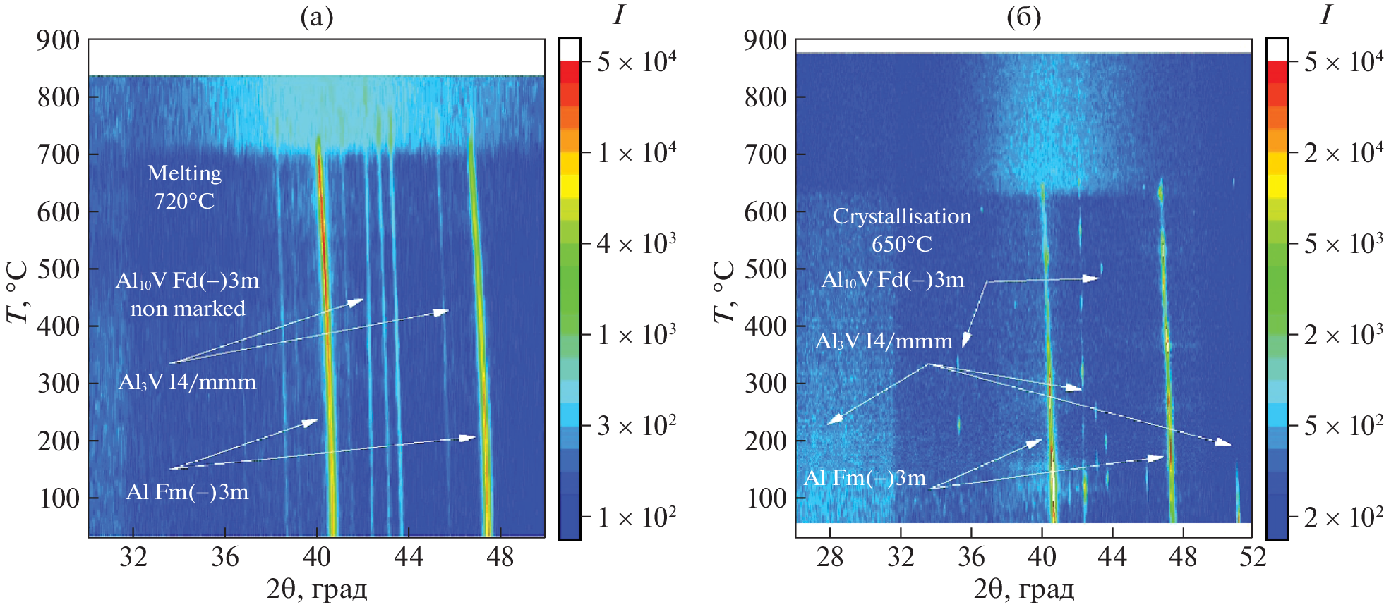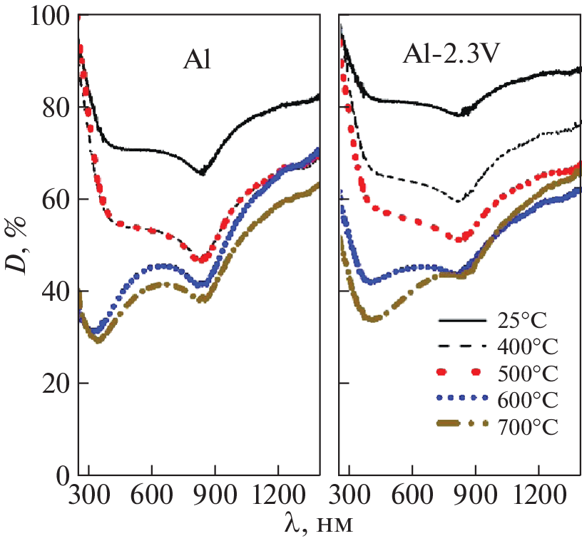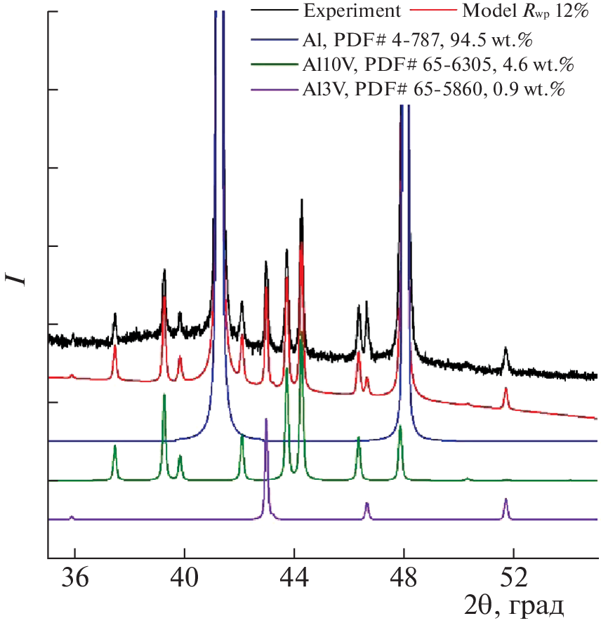 The oxidation stability and phase formation sequence for pure aluminum APK and Al–2.3%V alloy heated in air at rates of up to 100°C/min were analyzed by thermogravimetry with differential scanning calorimetry and X-ray diffraction using synchrotron radiation. It was established that an increase in the heating rate from 10 to 100°C/min does not significantly change the thermal stability of the modified Al powder. The presence of Al3V and Al10V intermetallic compounds, as well as a small amount of γ-Al2O3, in the structure of the alloy should favor consolidation of metal particles and reduce the porosity of the resulting product during selective laser melting (SLM).