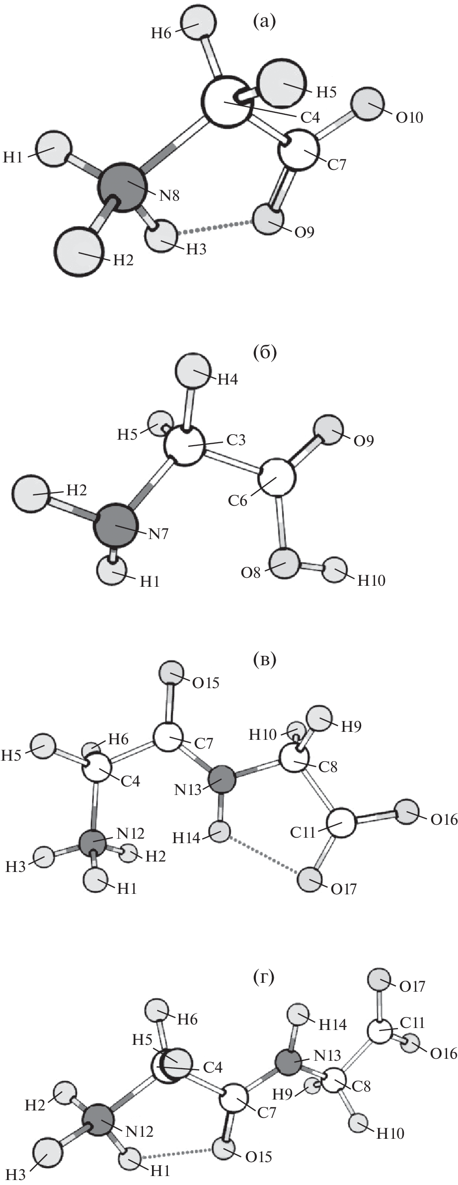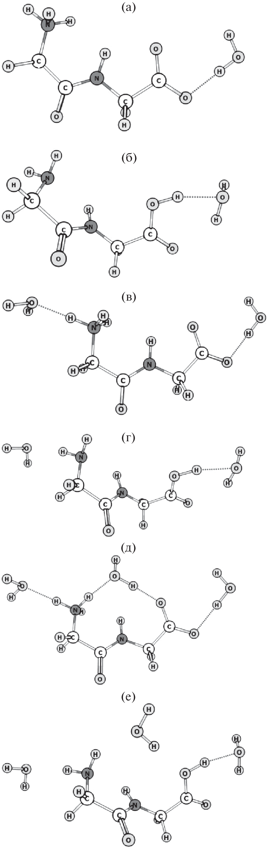 Проведены квантово-химические расчеты структуры молекулярных форм глицина и глицилглицина и сопряженных с ними ионных форм. Обобщены собственные и литературные данные по термодинамическим характеристикам реакций кислотно-основных взаимодействий глицина и глицилглицина в водно-органических растворах, рассмотрено влияние состава смешанных растворителей на константу кислотной диссоциации амидной группы в пептидном комплексе меди(II).