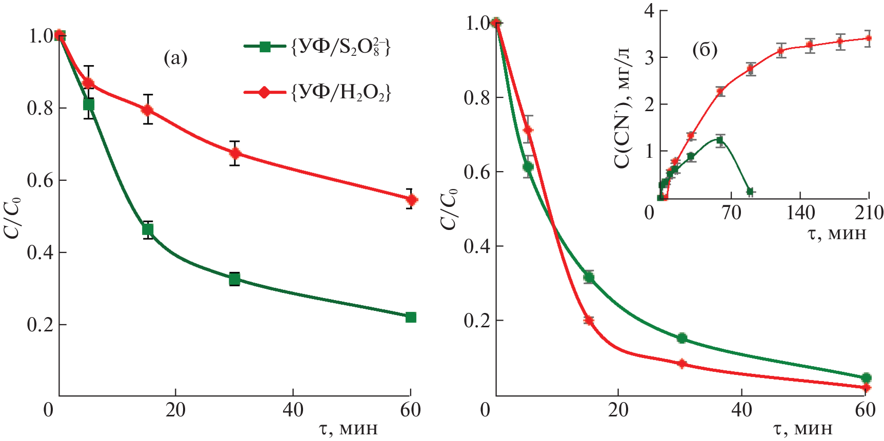 }) and hydrogen peroxide (oxidizing system {UV/H2O2}) under the influence of quasi-monochromatic UVC radiation from a KrCl excilamp (222 nm) have been studied. According to the efficiency and rate of the destruction of the target compound, the oxidizing systems under study can be arranged in the following series: {UV/S2O2-8} > {UV/H2O2} > {UV}. The effective destruction of hexacyanoferrates at micromolar concentrations (≤47 μM) to nontoxic and biodegradable compounds in the combined {UV/S2O2-8} system is due to the high oxidizing ability of reactive oxygen species formed as a result of persulfate photolysis.