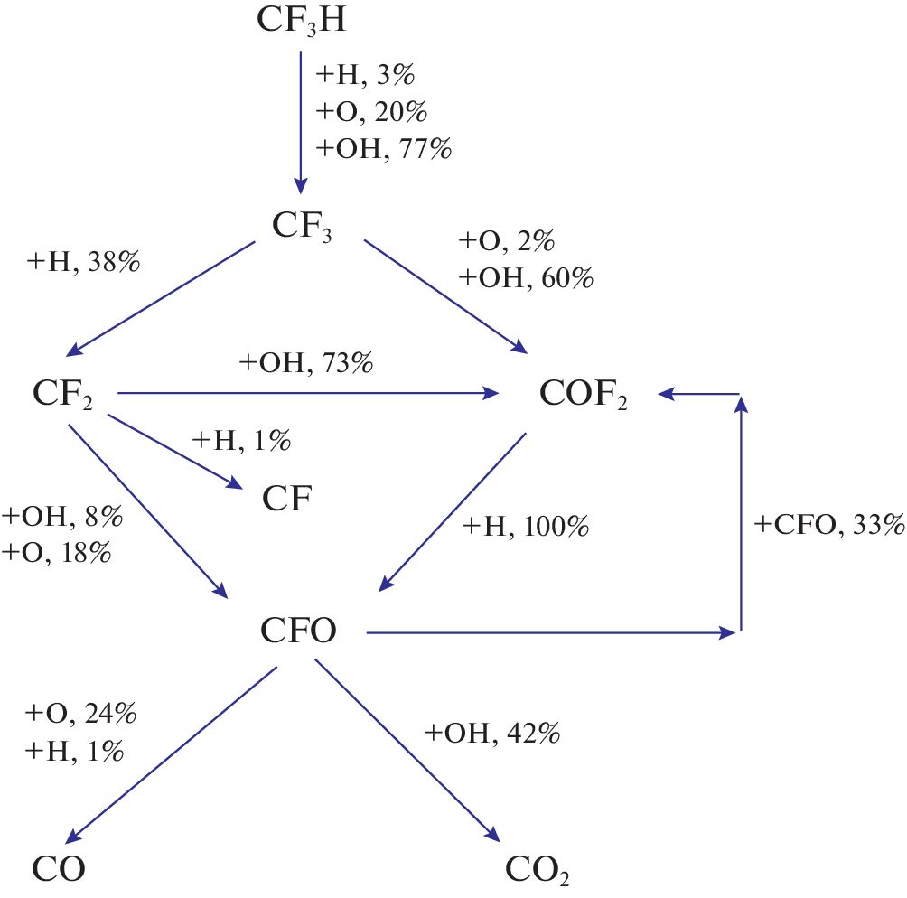 The mechanism of CF3H transformation in the flame of methane–oxygen mixtures of various compositions was calculated from the available experimental data on the concentrations of intermediates, taking into account only those elementary reactions whose kinetic parameters are known. In the flame of a CH4/O2 mixture, CF3H is destroyed in reactions with H, O, and OH without being regenerated, which disproves the classical (and still existing) ideas about the molecular mechanism of the transformation of initial reagents in the flame. In a rich mixture, the transformation mainly proceeds due to the reactions of CF3H, CF3, СF2, and COF2 with atomic hydrogen, competing with the stage of branching of the reaction chains that inhibit the combustion of methane in oxygen. In a stoichiometric and especially in a lean mixture, the role of oxidative processes involving O and OH increases, and the inhibition effect weakens. The resulting scheme qualitatively describes the entire known experimental picture observed during the combustion of CH4/O2/CF3H mixtures.